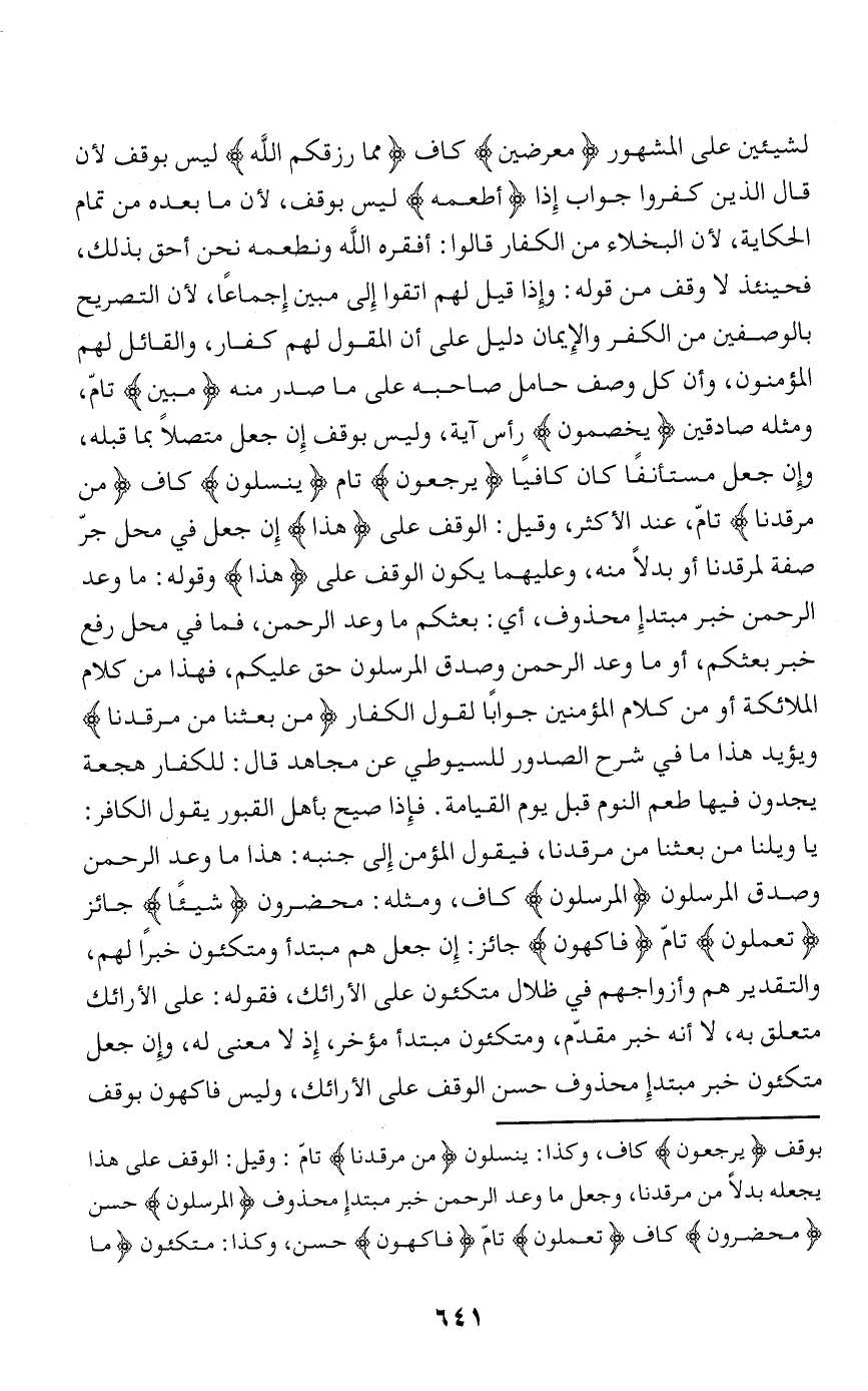 لشيئين على المشهور مُعْرِضِينَ كاف مِمَّا رَزَقَكُمُ اللَّهُ ليس بوقف لأن قال الذين كفروا جواب إذا أَطْعَمَهُ ليس بوقف، لأن ما بعده من تمام الحكاية، لأن البخلاء من الكفار قالوا: أفقره الله ونطعمه نحن أحق بذلك، فحينئذ لا وقف من قوله: وإذا قيل لهم اتقوا إلى مبين إجماعا، لأن التصريح بالوصفين من الكفر والإيمان دليل على أن المقول لهم كفار، والقائل لهم المؤمنون، وأن كل وصف حامل صاحبه على ما صدر منه مُبِينٍ تامّ، ومثله صادقين يَخِصِّمُونَ رأس آية، وليس بوقف إن جعل متصلا بما قبله، وإن جعل مستأنفا كان كافيا يَرْجِعُونَ تام يَنْسِلُونَ كاف مِنْ مَرْقَدِنا تامّ، عند الأكثر، وقيل: الوقف على هذا إن جعل في محل جرّ صفة لمرقدنا أو بدلا منه، وعليهما يكون الوقف على هذا وقوله: ما وعد الرحمن خبر مبتدإ محذوف، أي: بعثكم ما وعد الرحمن، فما في محل رفع خبر بعثكم، أو ما وعد الرحمن وصدق المرسلون حق عليكم، فهذا من كلام الملائكة أو من كلام المؤمنين جوابا لقول الكفار مَنْ بَعَثَنا مِنْ مَرْقَدِنا ويؤيد هذا ما في شرح الصدور للسيوطي عن مجاهد قال: للكفار هجعة يجدون فيها طعم النوم قبل يوم القيامة. فإذا صيح بأهل القبور يقول الكافر: