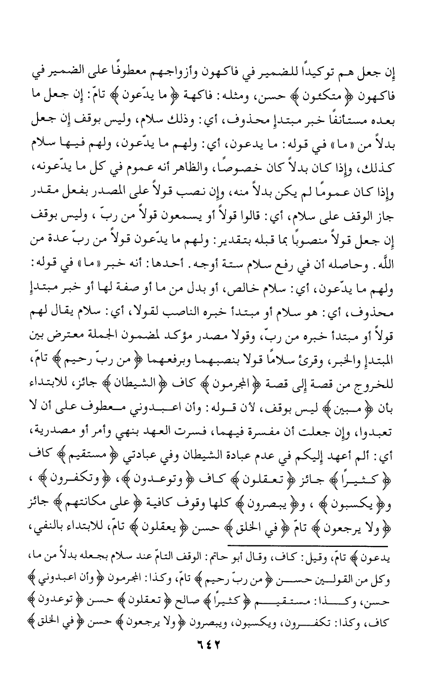 جائز، للابتداء بأن مُبِينٌ ليس بوقف، لأن قوله: وأن اعبدوني معطوف على أن لا تعبدوا، وإن جعلت أن مفسرة فيهما، فسرت العهد بنهي وأمر أو مصدرية، أي: ألم أعهد إليكم في عدم عبادة الشيطان وفي عبادتي مُسْتَقِيمٌ كاف كَثِيراً جائز تَعْقِلُونَ كاف وتُوعَدُونَ، وتَكْفُرُونَ، ويَكْسِبُونَ، ويُبْصِرُونَ كلها وقوف كافية عَلى مَكانَتِهِمْ جائز وَلا يَرْجِعُونَ تامّ فِي الْخَلْقِ حسن يَعْقِلُونَ تامّ، للابتداء بالنفي،