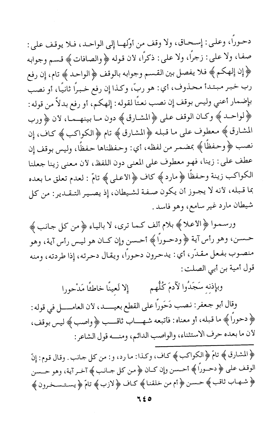 ورسموا الأعلا بلام ألف كما ترى، لا بالياء مِنْ كُلِّ جانِبٍ حسن، وهو رأس آية ودُحُوراً أحسن وإن كان هو ليس رأس آية، وهو منصوب بفعل مقدّر، أي: يدحرون دحورا، ويقال دحرته، إذا طردته، ومنه قول أمية بن أبي الصلت:
