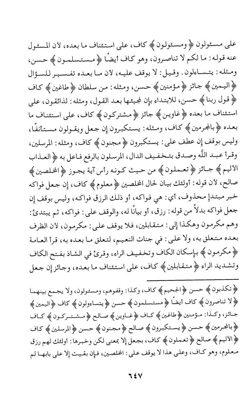 على مسئولون ومَسْؤُلُونَ كاف، على استئناف ما بعده، لأن المسئول عنه قوله: ما لكم لا تناصرون، وهو كاف أيضا مُسْتَسْلِمُونَ حسن، ومثله: يتساءلون. وقيل: لا يوقف عليه، لأن ما بعده تفسير للسؤال الْيَمِينِ جائز مُؤْمِنِينَ حسن، ومثله: من سلطان طاغِينَ كاف قَوْلُ رَبِّنا حسن، للابتداء بإن لمجيئها بعد القول، ومثله: لذائقون، على استئناف ما بعده غاوِينَ جائز مُشْتَرِكُونَ كاف، على استئناف ما بعده بِالْمُجْرِمِينَ كاف، ومثله: يستكبرون إن جعل ويقولون مستأنفا، وليس بوقف إن عطف على: يستكبرون مَجْنُونٍ كاف، ومثله: المرسلين، وقرأ عبد الله وصدق بتخفيف الدال، المرسلون بالرفع فاعل به الْعَذابِ الْأَلِيمِ جائز تَعْمَلُونَ من حيث كونه رأس آية يجوز الْمُخْلَصِينَ صالح، لأن قوله: أولئك بيان لحال المخلصين مَعْلُومٌ كاف، إن جعل فواكه خبر مبتدإ محذوف، أي: هي فواكه، أو ذلك الرزق فواكه، وليس بوقف إن جعل فواكه بدلا من قوله: رزق، أو بيانا له، والوقف على: فواكه، ثم يبتدئ: