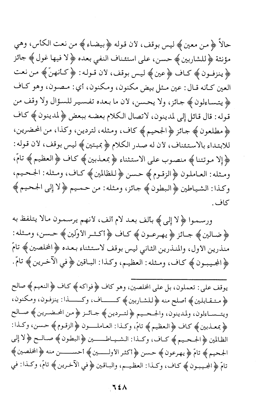 حالا مِنْ مَعِينٍ ليس بوقف، لأن قوله بَيْضاءَ من نعت الكأس، وهي مؤنثة لِلشَّارِبِينَ حسن، على استئناف النفي بعده لا فِيها غَوْلٌ جائز يُنْزَفُونَ كاف عِينٌ ليس بوقف، لأن قوله: كَأَنَّهُنَّ من نعت العين كأنه قال: عين مثل بيض مكنون، ومكنون، أي: مصون، وهو كاف يَتَساءَلُونَ جائز، ولا يحسن، لأن ما بعده تفسير للسؤال ولا وقف من قوله: قال قائل إلى لمدينون، لاتصال الكلام بعضه ببعض لَمَدِينُونَ كاف مُطَّلِعُونَ جائز الْجَحِيمِ كاف، ومثله، لتردين، وكذا، من المحضرين، للابتداء بالاستئناف، لأن له صدر الكلام بِمَيِّتِينَ ليس بوقف، لأن قوله:
