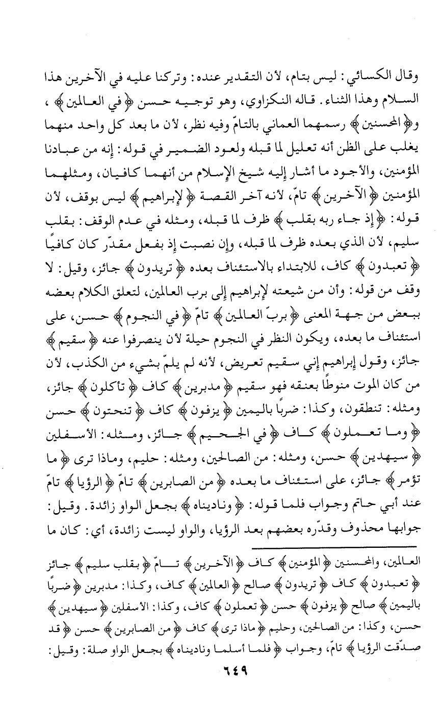 وقال الكسائي: ليس بتام، لأن التقدير عنده: وتركنا عليه في الآخرين هذا السلام وهذا الثناء. قاله النكزاوي، وهو توجيه حسن فِي الْعالَمِينَ، والْمُحْسِنِينَ رسمهما العماني بالتامّ وفيه نظر، لأن ما بعد كل واحد منهما يغلب على الظن أنه تعليل لما قبله ولعود الضمير في قوله: إنه من عبادنا المؤمنين، والأجود ما أشار إليه شيخ الإسلام من أنهما كافيان، ومثلهما المؤمنين الْآخَرِينَ تامّ، لأنه آخر القصة لَإِبْراهِيمَ ليس بوقف، لأن قوله: إِذْ جاءَ رَبَّهُ بِقَلْبٍ ظرف لما قبله، ومثله في عدم الوقف: بقلب سليم، لأن الذي بعده ظرف لما قبله، وإن نصبت إذ بفعل مقدّر كان كافيا تَعْبُدُونَ كاف، للابتداء بالاستئناف بعده تُرِيدُونَ جائز، وقيل: لا وقف من قوله: وأن من شيعته لإبراهيم إلى برب العالمين، لتعلق الكلام بعضه ببعض من جهة المعنى بِرَبِّ الْعالَمِينَ تامّ فِي النُّجُومِ حسن، على استئناف ما بعده، ويكون النظر في النجوم حيلة لأن ينصرفوا عنه سَقِيمٌ جائز، وقول إبراهيم إني سقيم تعريض، لأنه لم يلمّ بشيء من الكذب، لأن من كان الموت منوطا بعنقه فهو سقيم مُدْبِرِينَ كاف تَأْكُلُونَ جائز، ومثله: تنطقون، وكذا: ضربا باليمين يَزِفُّونَ كاف تَنْحِتُونَ حسن وَما تَعْمَلُونَ كاف فِي الْجَحِيمِ جائز، ومثله: الأسفلين سَيَهْدِينِ حسن، ومثله: من الصالحين، ومثله: حليم، وماذا ترى ما تُؤْمَرُ جائز، على استئناف ما بعده مِنَ الصَّابِرِينَ تامّ الرُّؤْيا تامّ عند أبي حاتم وجواب فلما قوله: وَنادَيْناهُ بجعل الواو زائدة. وقيل:
