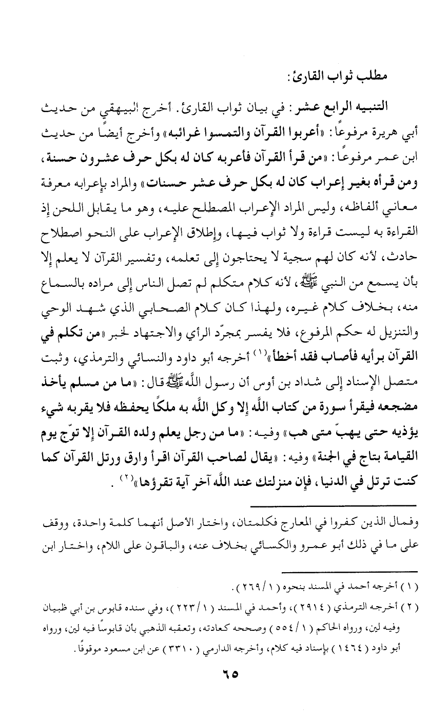 أخرج البيهقي من حديث أبي هريرة مرفوعا: «أعربوا القرآن والتمسوا غرائبه» وأخرج أيضا من حديث ابن عمر مرفوعا: «من قرأ القرآن فأعربه كان له بكل حرف عشرون حسنة، ومن قرأه بغير إعراب كان له بكل حرف عشر حسنات» والمراد بإعرابه معرفة معاني ألفاظه، وليس المراد الإعراب المصطلح عليه، وهو ما يقابل اللحن إذ القراءة به ليست قراءة ولا ثواب فيها، وإطلاق الإعراب على النحو اصطلاح حادث، لأنه كان لهم سجية لا يحتاجون إلى تعلمه، وتفسير القرآن لا يعلم إلا بأن يسمع من النبي صلّى الله عليه وسلّم، لأنه كلام متكلم لم تصل الناس إلى مراده بالسماع منه، بخلاف كلام غيره، ولهذا كان كلام الصحابي الذي شهد الوحي والتنزيل له حكم المرفوع، فلا يفسر بمجرّد الرأي والاجتهاد لخبر «من تكلم في القرآن برأيه فأصاب فقد أخطأ» (¬1) أخرجه أبو داود والنسائي والترمذي، وثبت متصل الإسناد إلى شداد بن أوس أن رسول الله صلّى الله عليه وسلّم قال: «ما من مسلم يأخذ مضجعه فيقرأ سورة من كتاب الله إلا وكل الله به ملكا يحفظه فلا يقربه شيء يؤذيه حتى يهبّ متى هب» وفيه: «ما من رجل يعلم ولده القرآن إلا توّج يوم القيامة بتاج في الجنة» وفيه: «يقال لصاحب القرآن اقرأ وارق ورتل القرآن كما كنت ترتل في الدنيا، فإن منزلتك عند الله آخر آية تقرؤها» (¬2).