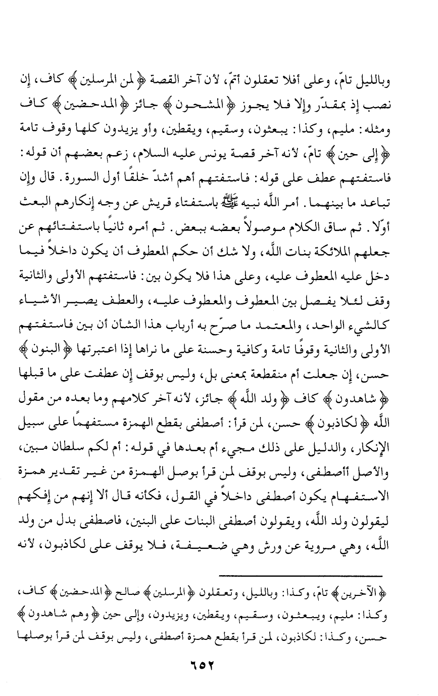 وبالليل تامّ، وعلى أفلا تعقلون أتمّ، لأن آخر القصة لَمِنَ الْمُرْسَلِينَ كاف، إن نصب إذ بمقدّر وإلا فلا يجوز الْمَشْحُونِ جائز الْمُدْحَضِينَ كاف ومثله: مليم، وكذا: يبعثون، وسقيم، ويقطين، وأو يزيدون كلها وقوف تامة إِلى حِينٍ تامّ، لأنه آخر قصة يونس عليه السلام، زعم بعضهم أن قوله: