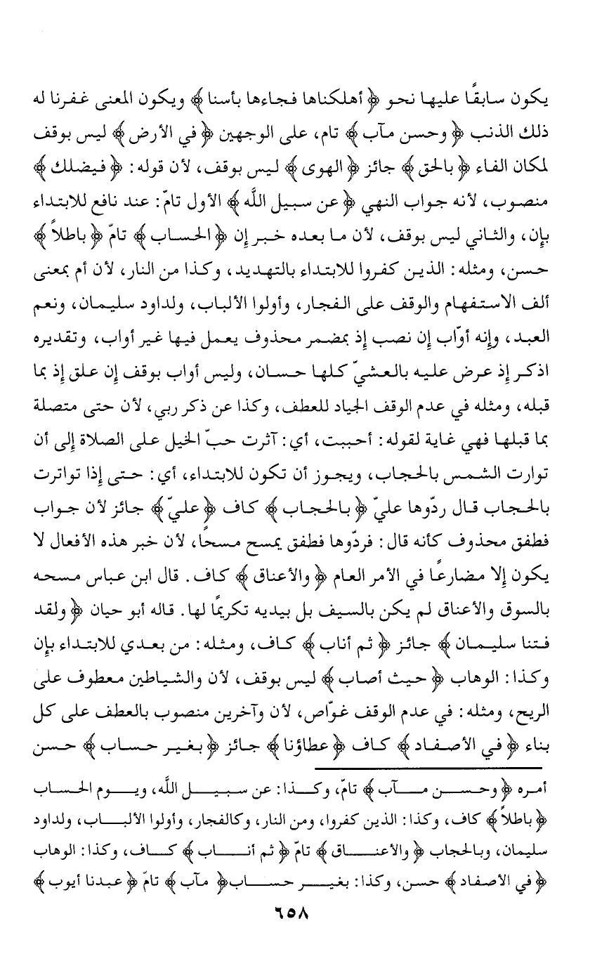 يكون سابقا عليها نحو أَهْلَكْناها فَجاءَها بَأْسُنا ويكون المعنى غفرنا له ذلك الذنب وَحُسْنَ مَآبٍ تام، على الوجهين فِي الْأَرْضِ ليس بوقف لمكان الفاء بِالْحَقِّ جائز الْهَوى ليس بوقف، لأن قوله: فَيُضِلَّكَ منصوب، لأنه جواب النهي عَنْ سَبِيلِ اللَّهِ الأول تامّ: عند نافع للابتداء بإن، والثاني ليس بوقف، لأن ما بعده خبر إن الْحِسابِ تامّ باطِلًا حسن، ومثله: الذين كفروا للابتداء بالتهديد، وكذا من النار، لأن أم بمعنى ألف الاستفهام والوقف على الفجار، وأولوا الألباب، ولداود سليمان، ونعم العبد، وإنه أوّاب إن نصب إذ بمضمر محذوف يعمل فيها غير أواب، وتقديره اذكر إذ عرض عليه بالعشيّ كلها حسان، وليس أواب بوقف إن علق إذ بما قبله، ومثله في عدم الوقف الجياد للعطف، وكذا عن ذكر ربي، لأن حتى متصلة بما قبلها فهي غاية لقوله: أحببت، أي: آثرت حبّ الخيل على الصلاة إلى أن توارت الشمس بالحجاب، ويجوز أن تكون للابتداء، أي: حتى إذا تواترت بالحجاب قال ردّوها عليّ بِالْحِجابِ كاف عَلَيَّ جائز لأن جواب فطفق محذوف كأنه قال: فردّوها فطفق يمسح مسحا، لأن خبر هذه الأفعال لا يكون إلا مضارعا في الأمر العام وَالْأَعْناقِ كاف. قال ابن عباس مسحه بالسوق والأعناق لم يكن بالسيف بل بيديه تكريما لها. قاله أبو حيان وَلَقَدْ فَتَنَّا سُلَيْمانَ جائز ثُمَّ أَنابَ كاف، ومثله: من بعدي للابتداء بإن وكذا: الوهاب حَيْثُ أَصابَ ليس بوقف، لأن والشياطين معطوف على الريح، ومثله: في عدم الوقف غوّاص، لأن وآخرين منصوب بالعطف على كل بناء فِي الْأَصْفادِ كاف عَطاؤُنا جائز بِغَيْرِ حِسابٍ حسن