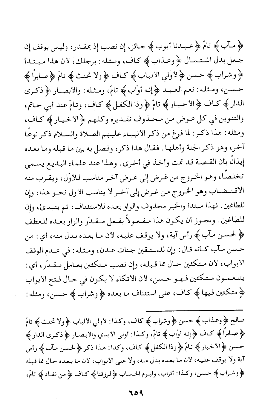 مَآبٍ تامّ عَبْدَنا أَيُّوبَ جائز، إن نصب إذ بمقدر، وليس بوقف إن جعل بدل اشتمال وَعَذابٍ كاف، ومثله: برجلك، لأن هذا مبتدأ وَشَرابٌ حسن لِأُولِي الْأَلْبابِ كاف وَلا تَحْنَثْ تامّ صابِراً حسن، ومثله: نعم العبد إِنَّهُ أَوَّابٌ تامّ، ومثله: والأبصار ذِكْرَى الدَّارِ كاف الْأَخْيارِ تامّ وَذَا الْكِفْلِ كاف، وتامّ عند أبي حاتم، والتنوين في كل عوض من محذوف تقديره وكلهم الْأَخْيارِ كاف، ومثله: هذا ذكر: لما فرغ من ذكر الأنبياء عليهم الصلاة والسلام ذكر نوعا آخر، وهو ذكر الجنة وأهلها. فقال هذا ذكر، وفصل به بين ما قبله وما بعده إيذانا بأن القصة قد تمت وأخذ في أخرى. وهذا عند علماء البديع يسمى تخلصا، وهو الخروج من غرض إلى غرض آخر مناسب للأوّل، ويقرب منه الاقتضاب وهو الخروج من غرض إلى آخر لا يناسب الأول نحو هذا، وإن للطاغين. فهذا مبتدأ والخبر محذوف والواو بعده للاستئناف، ثم يبتدئ، وإن للطاغين. ويجوز أن يكون هذا مفعولا بفعل مقدّر والواو بعده للعطف لَحُسْنَ مَآبٍ رأس آية، ولا يوقف عليه، لأن ما بعده بدل منه، أي: من حسن مآب كأنه قال: وإن للمتقين جنات عدن، ومثله: في عدم الوقف الأبواب، لأن متكئين حال مما قبله، وإن نصب متكئين بعامل مقدّر، أي: