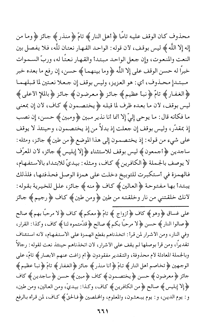 ساجدين أَجْمَعُونَ ليس بوقف للاستثناء إِلَّا إِبْلِيسَ جائز، لأن المعرّف لا يوصف بالجملة الْكافِرِينَ كاف، ومثله: بيديّ للابتداء بالاستفهام، فالهمزة في أستكبرت للتوبيخ دخلت على همزة الوصل فحذفتها، فلذلك يبتدأ بها مفتوحة الْعالِينَ كاف مِنْهُ جائز، علل للخيرية بقوله: