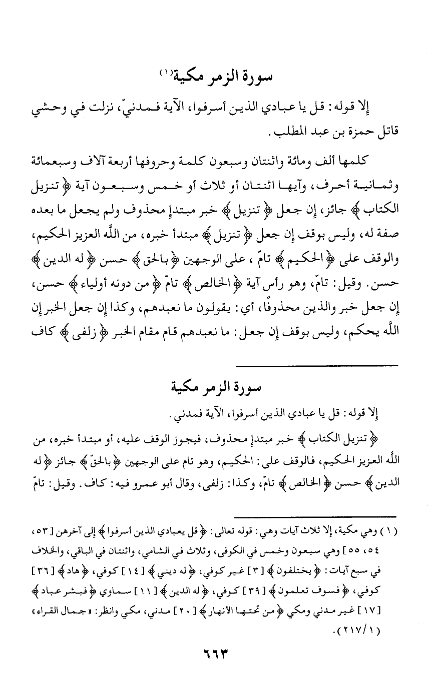 كلمها ألف ومائة واثنتان وسبعون كلمة وحروفها أربعة آلاف وسبعمائة وثمانية أحرف، وآيها اثنتان أو ثلاث أو خمس وسبعون آية تَنْزِيلُ الْكِتابِ جائز، إن جعل تَنْزِيلُ خبر مبتدإ محذوف ولم يجعل ما بعده صفة له، وليس بوقف إن جعل تَنْزِيلُ مبتدأ خبره، من الله العزيز الحكيم، والوقف على الْحَكِيمِ تامّ، على الوجهين بِالْحَقِّ حسن لَهُ الدِّينَ حسن. وقيل: تامّ، وهو رأس آية الْخالِصُ تامّ مِنْ دُونِهِ أَوْلِياءَ حسن، إن جعل خبر والذين محذوفا، أي: يقولون ما نعبدهم، وكذا إن جعل الخبر إن الله يحكم، وليس بوقف إن جعل: ما نعبدهم قام مقام الخبر زُلْفى كاف