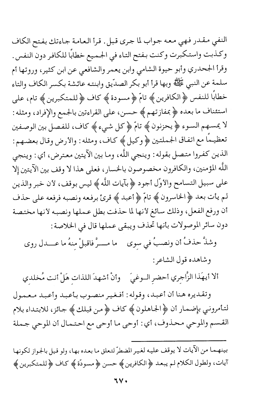 الذين كفروا متصل بقوله: وينجي الله، وما بين الآيتين معترض، أي: وينجي الله المؤمنين، والكافرون مخصوصون بالخسار، فعلى هذا لا وقف بين الآيتين إلا على سبيل التسامح والأوّل أجود بِآياتِ اللَّهِ ليس بوقف، لأن خبر والذين لم يأت بعد الْخاسِرُونَ تامّ أَعْبُدُ قرئ برفعه ونصبه فرفعه على حذف أن ورفع الفعل، وذلك سائغ لأنها لما حذفت بطل عملها ونصبه لأنها مختصة دون سائر الموصولات بأنها تحذف ويبقى عملها قال في الخلاصة: