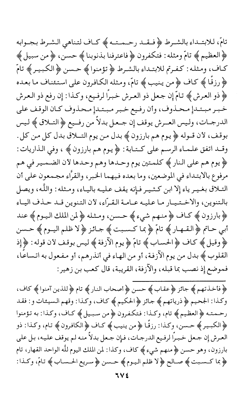 تامّ، للابتداء بالشرط فَقَدْ رَحِمْتَهُ كاف لتناهي الشرط بجوابه الْعَظِيمُ تامّ ومثله: فتكفرون فَاعْتَرَفْنا بِذُنُوبِنا حسن، مِنْ سَبِيلٍ كاف، ومثله: كفرتم للابتداء بالشرط تُؤْمِنُوا حسن الْكَبِيرِ تامّ رِزْقاً كاف مَنْ يُنِيبُ تامّ، ومثله الكافرون على استئناف ما بعده ذُو الْعَرْشِ تامّ إن جعل ذو العرش خبرا لرفيع، وكذا: إن رفع ذو العرش خبر مبتدإ محذوف، وأن رفيع خبر مبتدإ محذوف كان الوقف على الدرجات، وليس العرش يوقف إن جعل بدلا من رفيع التَّلاقِ ليس بوقف، لأن قوله يَوْمَ هُمْ بارِزُونَ بدل من يوم
