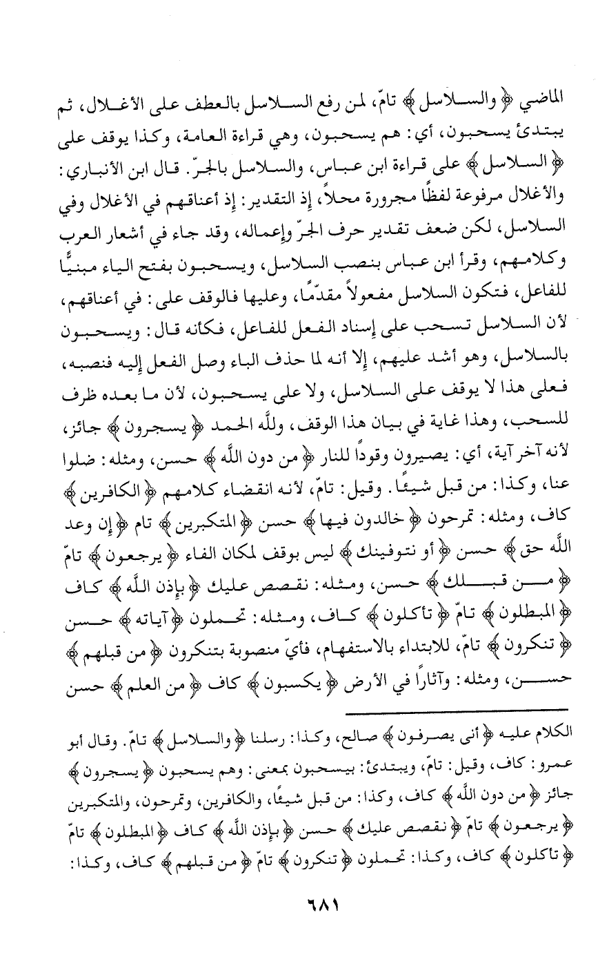 والأغلال مرفوعة لفظا مجرورة محلا، إذ التقدير: إذ أعناقهم في الأغلال وفي السلاسل، لكن ضعف تقدير حرف الجرّ وإعماله، وقد جاء في أشعار العرب وكلامهم، وقرأ ابن عباس بنصب السلاسل، ويسحبون بفتح الياء مبنيّا للفاعل، فتكون السلاسل مفعولا مقدّما، وعليها فالوقف على: في أعناقهم، لأن السلاسل تسحب على إسناد الفعل للفاعل، فكأنه قال: ويسحبون بالسلاسل، وهو أشد عليهم، إلا أنه لما حذف الباء وصل الفعل إليه فنصبه، فعلى هذا لا يوقف على السلاسل، ولا على يسحبون، لأن ما بعده ظرف للسحب، وهذا غاية في بيان هذا الوقف، ولله الحمد يُسْجَرُونَ جائز، لأنه آخر آية، أي: يصيرون وقودا للنار مِنْ دُونِ اللَّهِ حسن، ومثله: ضلوا عنا، وكذا: من قبل شيئا. وقيل: تامّ، لأنه انقضاء كلامهم الْكافِرِينَ كاف، ومثله: تمرحون خالِدِينَ فِيها حسن الْمُتَكَبِّرِينَ تامّ إِنَّ وَعْدَ اللَّهِ حَقٌّ حسن أَوْ نَتَوَفَّيَنَّكَ ليس بوقف لمكان الفاء يُرْجَعُونَ تامّ مِنْ قَبْلِكَ حسن، ومثله: نقصص عليك بِإِذْنِ اللَّهِ كاف الْمُبْطِلُونَ تامّ تَأْكُلُونَ كاف، ومثله: تحملون آياتِهِ حسن تُنْكِرُونَ تامّ، للابتداء بالاستفهام، فأيّ منصوبة بتنكرون مِنْ قَبْلِهِمْ حسن، ومثله: وآثارا في الأرض يَكْسِبُونَ كاف مِنَ الْعِلْمِ حسن