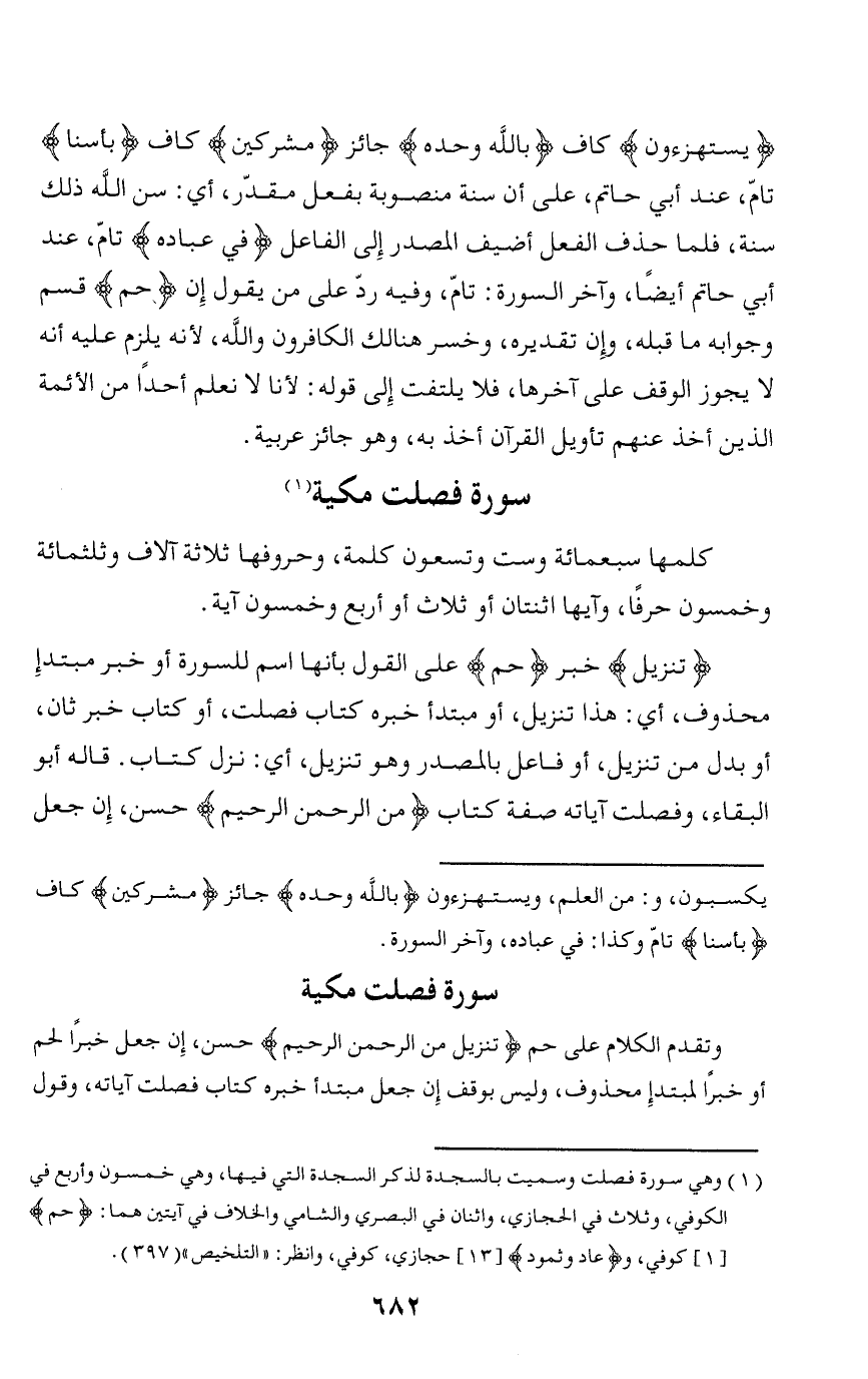 سورة فصلت مكية وتقدم الكلام على حم تَنْزِيلٌ مِنَ الرَّحْمنِ الرَّحِيمِ حسن، إن جعل خبرا لحم أو خبرا لمبتدإ محذوف، وليس بوقف إن جعل مبتدأ خبره كتاب فصلت آياته، وقول