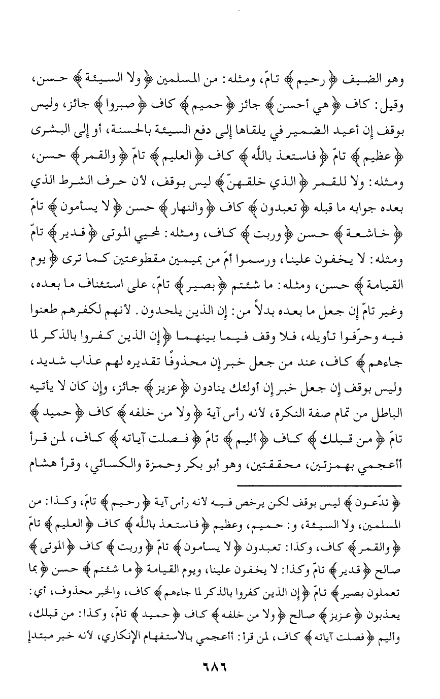 وهو الضيف رَحِيمٍ تامّ، ومثله: من المسلمين وَلَا السَّيِّئَةُ حسن، وقيل: كاف هِيَ أَحْسَنُ جائز حَمِيمٌ كاف صَبَرُوا جائز، وليس بوقف إن أعيد الضمير في يلقاها إلى دفع السيئة بالحسنة، أو إلى البشرى عَظِيمٍ تامّ فَاسْتَعِذْ بِاللَّهِ كاف الْعَلِيمُ تامّ وَالْقَمَرُ حسن، ومثله: ولا للقمر الَّذِي خَلَقَهُنَّ ليس بوقف، لأن حرف الشرط الذي بعده جوابه ما قبله تَعْبُدُونَ كاف وَالنَّهارِ حسن لا يَسْأَمُونَ تامّ خاشِعَةً حسن وَرَبَتْ كاف، ومثله: لمحيي الموتى قَدِيرٌ تامّ ومثله: لا يخفون علينا، ورسموا أمّ من بميمين مقطوعتين كما ترى يَوْمَ الْقِيامَةِ حسن، ومثله: ما شئتم بَصِيرٌ تامّ، على استئناف ما بعده، وغير تامّ إن جعل ما بعده بدلا من: إن الذين يلحدون. لأنهم لكفرهم طعنوا فيه وحرّفوا تأويله، فلا وقف فيما بينهما إِنَّ الَّذِينَ كَفَرُوا بِالذِّكْرِ لَمَّا جاءَهُمْ كاف، عند من جعل خبر إن محذوفا تقديره لهم عذاب شديد، وليس بوقف إن جعل خبر إن أولئك ينادون عَزِيزٌ جائز، وإن كان لا يأتيه الباطل من تمام صفة النكرة، لأنه رأس آية وَلا مِنْ خَلْفِهِ كاف حَمِيدٍ تامّ مِنْ قَبْلِكَ كاف أَلِيمٍ تامّ فُصِّلَتْ آياتُهُ كاف، لمن قرأ أأعجمي بهمزتين، محققتين، وهو أبو بكر وحمزة والكسائي، وقرأ هشام