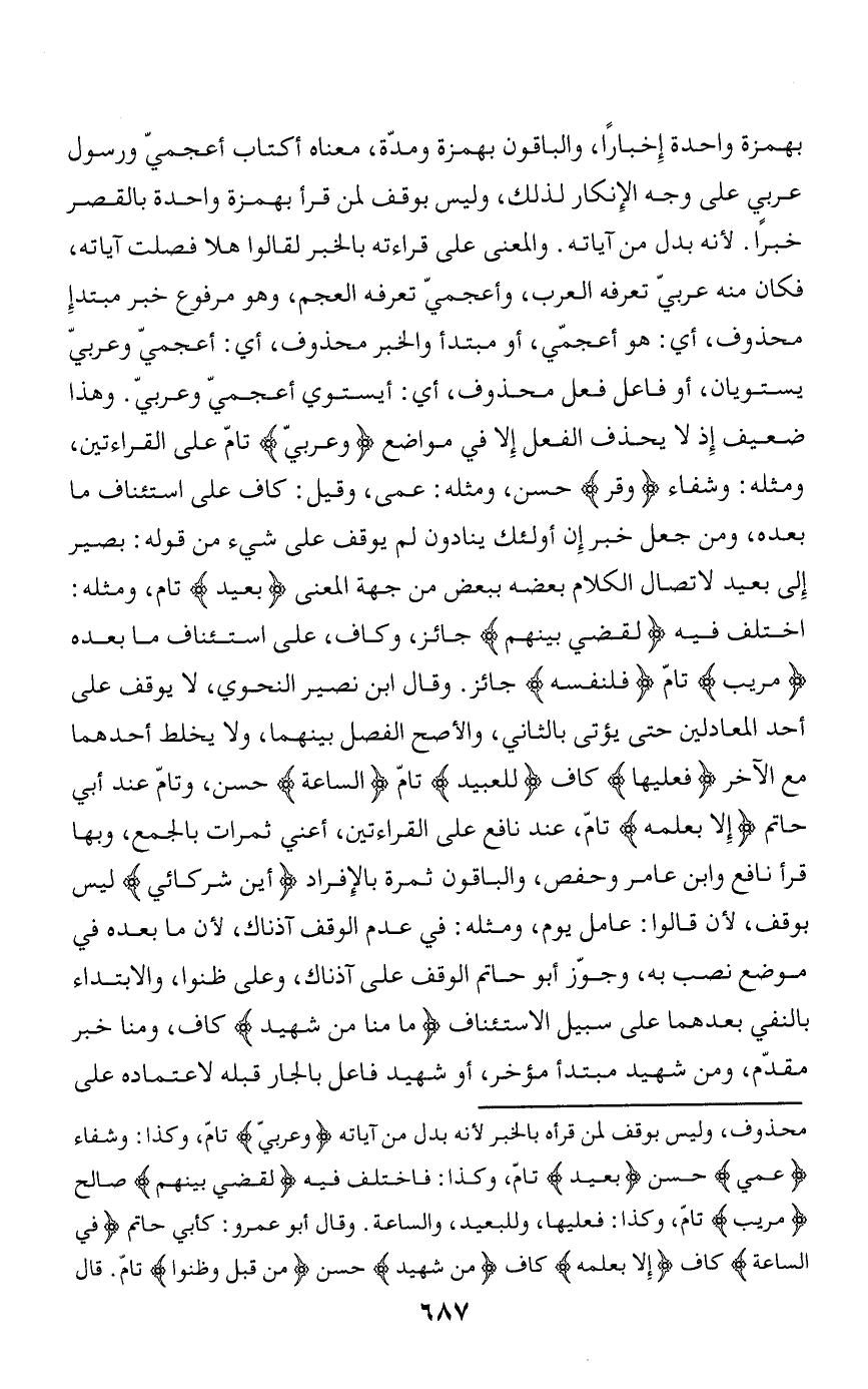 اختلف فيه لَقُضِيَ بَيْنَهُمْ جائز، وكاف، على استئناف ما بعده مُرِيبٍ تامّ فَلِنَفْسِهِ جائز. وقال ابن نصير النحوي، لا يوقف على أحد المعادلين حتى يؤتى بالثاني، والأصح الفصل بينهما، ولا يخلط أحدهما مع الآخر فَعَلَيْها كاف لِلْعَبِيدِ تامّ السَّاعَةِ حسن، وتامّ عند أبي حاتم إِلَّا بِعِلْمِهِ تامّ، عند نافع على القراءتين، أعني ثمرات بالجمع، وبها قرأ نافع وابن عامر وحفص، والباقون ثمرة بالإفراد أَيْنَ شُرَكائِي ليس بوقف، لأن قالوا: عامل يوم، ومثله: في عدم الوقف آذناك، لأن ما بعده في موضع نصب به، وجوّز أبو حاتم الوقف على آذناك، وعلى ظنوا، والابتداء بالنفي بعدهما على سبيل الاستئناف ما مِنَّا مِنْ شَهِيدٍ كاف، ومنا خبر مقدّم، ومن شهيد مبتدأ مؤخر، أو شهيد فاعل بالجار قبله لاعتماده على