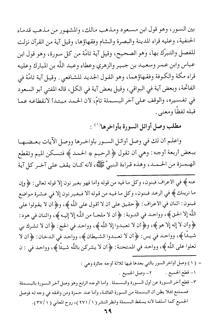 3 - قطع آخر السورة عن أول السورة والبسملة. وأما الوجه الرابع وهو وصل آخر السورة بالبسملة فممتنع لئلا يظن أن البسملة من السورة الفائتة، وأما عند حمزة ومن وافقه في وجه له فوصل الجميع كما أسلفنا لأنه يسقط البسملة وانظر النشر (1/ 271)، روح المعاني (1/ 37).
