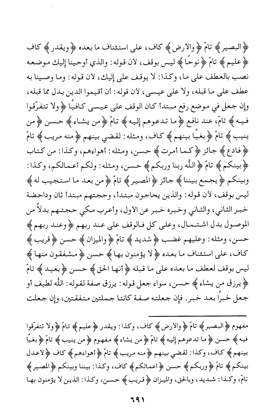 الْبَصِيرُ تامّ وَالْأَرْضِ كاف، على استئناف ما بعده وَيَقْدِرُ كاف عَلِيمٌ تامّ نُوحاً ليس بوقف، لأن قوله: والذي أوحينا إليك موضعه نصب بالعطف على ما، وكذا: لا يوقف على إليك، لأن قوله: وما وصينا به عطف على ما قبله، ولا على عيسى، لأن قوله: أن أقيموا الدين بدل مما قبله، وإن جعل في موضع رفع مبتدأ كان الوقف على عيسى كافيا وَلا تَتَفَرَّقُوا فِيهِ تامّ، عند نافع ما تَدْعُوهُمْ إِلَيْهِ تامّ مَنْ يَشاءُ حسن مَنْ يُنِيبُ تامّ بَغْياً بَيْنَهُمْ كاف، ومثله: لقضي بينهم مِنْهُ مُرِيبٍ تامّ فَادْعُ جائز كَما أُمِرْتَ حسن، ومثله: أهواءهم، وكذا: من كتاب بَيْنَكُمُ تامّ اللَّهُ رَبُّنا وَرَبُّكُمْ حسن، ومثله: ولكم أعمالكم، وكذا: