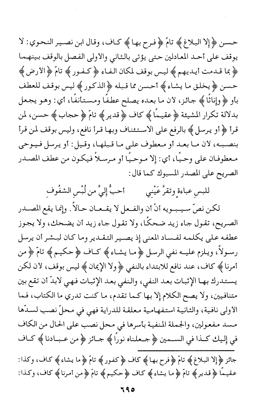 لكن نصّ سيبويه أن أن والفعل لا يقعان حالا. وإنما يقع المصدر الصريح، تقول جاء زيد ضحكا، ولا تقول جاء زيد أن يضحك، ولا يجوز عطفه على يكلمه لفساد المعنى إذ يصير التقدير وما كان لبشر أن يرسل رسولا، ويلزم عليه نفي الرسل ما يَشاءُ كاف حَكِيمٌ تامّ مِنْ أَمْرِنا كاف، عند نافع للابتداء بالنفي وَلَا الْإِيمانُ ليس بوقف، لأن لكن يستدرك بها الإثبات بعد النفي، والنفي بعد الإثبات فهي لا بدّ أن تقع بين متنافيين، ولا يصح الكلام إلا بها كما تقدم، ما كنت تدري ما الكتاب، فما الأولى نافية، والثانية استفهامية معلقة للدارية فهي في محلّ نصب لسدّها مسد مفعولين، والجملة المنفية بأسرها في محل نصب على الحال من الكاف في إليك كذا في السمين جَعَلْناهُ نُوراً جائز مِنْ عِبادِنا كاف