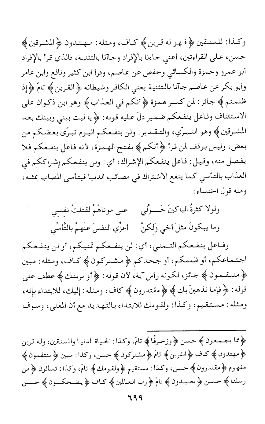 وكذا: للمتقين فَهُوَ لَهُ قَرِينٌ كاف، ومثله: مهتدون الْمَشْرِقَيْنِ حسن، على القراءتين، أعني جاءنا بالإفراد وجاءانا بالتثنية، فالذي قرأ بالإفراد أبو عمرو وحمزة والكسائي وحفص عن عاصم، وقرأ ابن كثير ونافع وابن عامر وأبو بكر عن عاصم جاءانا بالتثنية يعني الكافر وشيطانه الْقَرِينُ تامّ إِذْ ظَلَمْتُمْ جائز: لمن كسر همزة أَنَّكُمْ فِي الْعَذابِ وهو ابن ذكوان على الاستئناف وفاعل ينفعكم ضمير دلّ عليه قوله: يا لَيْتَ بَيْنِي وَبَيْنَكَ بُعْدَ الْمَشْرِقَيْنِ وهو التبرّي، والتقدير: ولن ينفعكم اليوم تبرّى بعضكم من بعض، وليس بوقف لمن قرأ أَنَّكُمْ بفتح الهمزة، لأنه فاعل ينفعكم فلا يفصل منه، وقيل: فاعل ينفعكم الإشراك، أي: ولن ينفعكم إشراككم في العذاب بالتأسي كما ينفع الاشتراك في مصائب الدنيا فيتأسى المصاب بمثله، ومنه قول الخنساء: