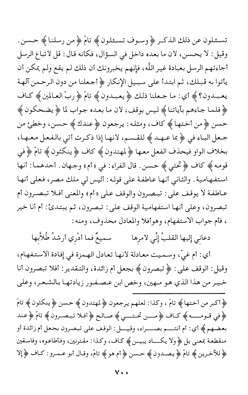 وقيل: لا يحسن، لأن ما بعده داخل في السؤال، فكأنه قال: قل لأتباع الرسل أجاءتهم الرسل بعبادة غير الله، فإنهم يخبرونك أن ذلك لم يقع ولم يمكن أن يأتوا به قبلك، ثم ابتدأ على سبيل الإنكار أَجَعَلْنا مِنْ دُونِ الرَّحْمنِ آلِهَةً يُعْبَدُونَ؟ أي: ما جعلنا ذلك يُعْبَدُونَ تامّ رَبِّ الْعالَمِينَ كاف فَلَمَّا جاءَهُمْ بِآياتِنا ليس بوقف، لأن ما بعده جواب لما يَضْحَكُونَ حسن مِنْ أُخْتِها كاف، ومثله: يرجعون عِنْدَكَ حسن، وخطئ من جعل الباء في بِما عَهِدَ للقسم، لأنها إذا ذكرت أتي بالفعل معها، بخلاف الواو فيحذف الفعل معها لَمُهْتَدُونَ كاف يَنْكُثُونَ تامّ فِي قَوْمِهِ كاف تَحْتِي حسن. قال الفراء: في «أم» وجهان. أحدهما: أنها استفهامية. والثاني أنها عاطفة على قوله: أليس لي ملك مصر، فعلى أنها