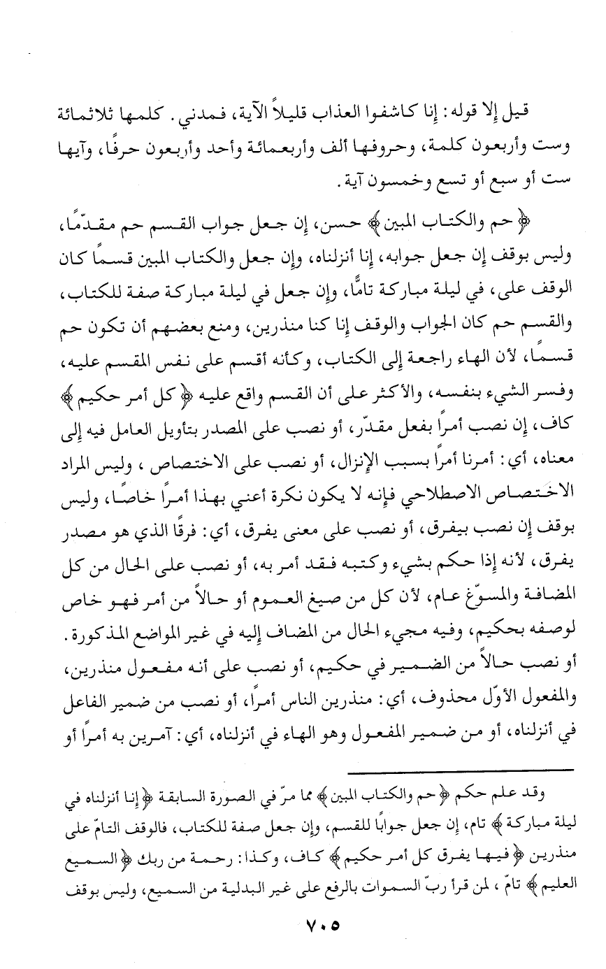 حم وَالْكِتابِ الْمُبِينِ حسن، إن جعل جواب القسم حم مقدّما، وليس بوقف إن جعل جوابه، إنا أنزلناه، وإن جعل والكتاب المبين قسما كان الوقف على، في ليلة مباركة تامّا، وإن جعل في ليلة مباركة صفة للكتاب، والقسم حم كان الجواب والوقف إنا كنا منذرين، ومنع بعضهم أن تكون حم قسما، لأن الهاء راجعة إلى الكتاب، وكأنه أقسم على نفس المقسم عليه، وفسر الشيء بنفسه، والأكثر على أن القسم واقع عليه كُلُّ أَمْرٍ حَكِيمٍ كاف، إن نصب أمرا بفعل مقدّر، أو نصب على المصدر بتأويل العامل فيه إلى معناه، أي: أمرنا أمرا بسبب الإنزال، أو نصب على الاختصاص، وليس المراد الاختصاص الاصطلاحي فإنه لا يكون نكرة أعني بهذا أمرا خاصا، وليس بوقف إن نصب بيفرق، أو نصب على معنى يفرق، أي: فرقا الذي هو مصدر يفرق، لأنه إذا حكم بشيء وكتبه فقد أمر به، أو نصب على الحال من كل المضافة والمسوّغ عام، لأن كل من صيغ العموم أو حالا من أمر فهو خاص لوصفه بحكيم، وفيه مجيء الحال من المضاف إليه في غير المواضع المذكورة.