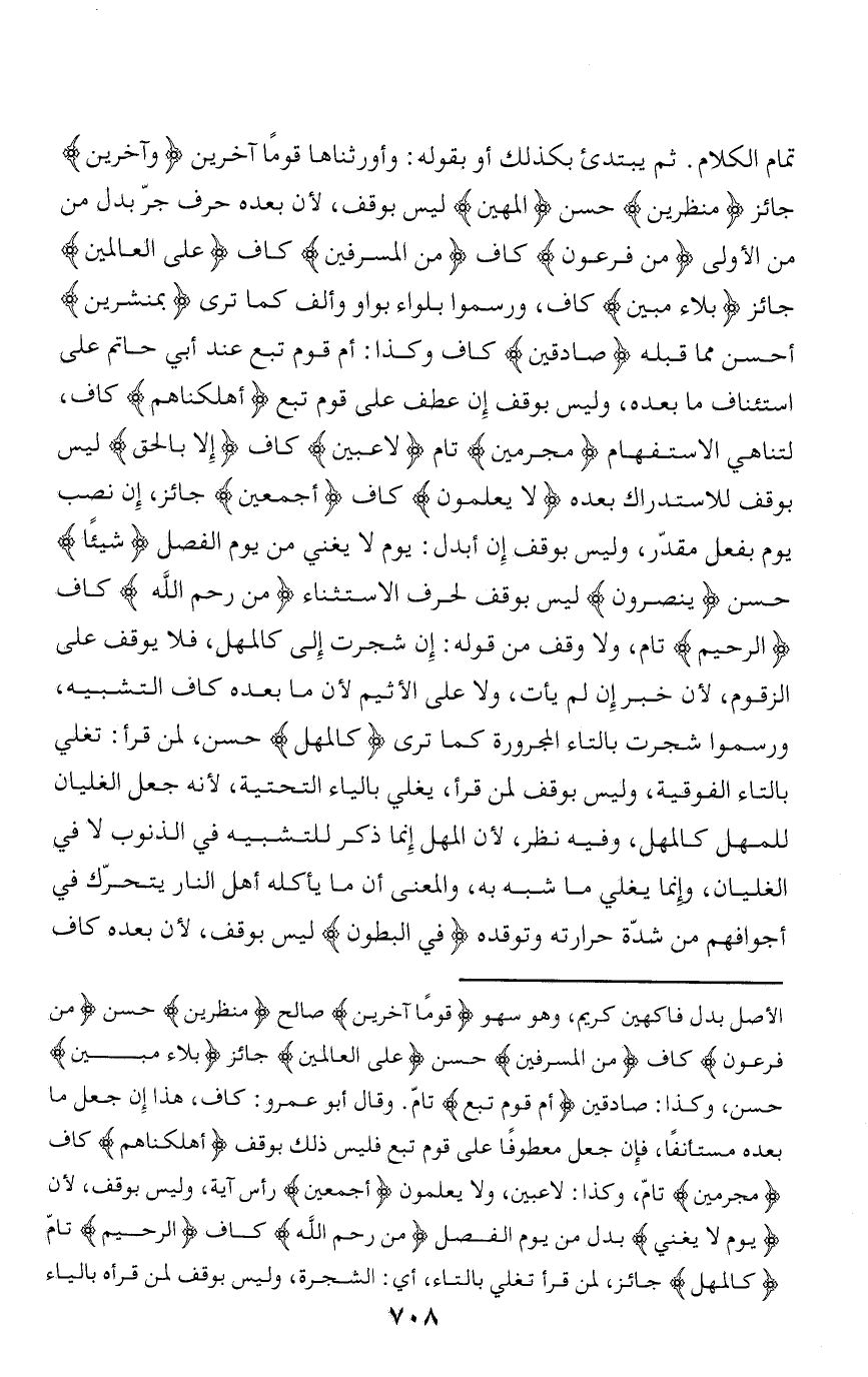 الأصل بدل فاكهين كريم، وهو سهو قَوْماً آخَرِينَ صالح مُنْظَرِينَ حسن مِنْ فِرْعَوْنَ كاف مِنَ الْمُسْرِفِينَ حسن عَلَى الْعالَمِينَ جائز بَلؤُا مُبِينٌ حسن، وكذا: صادقين أَمْ قَوْمُ تُبَّعٍ تامّ. وقال أبو