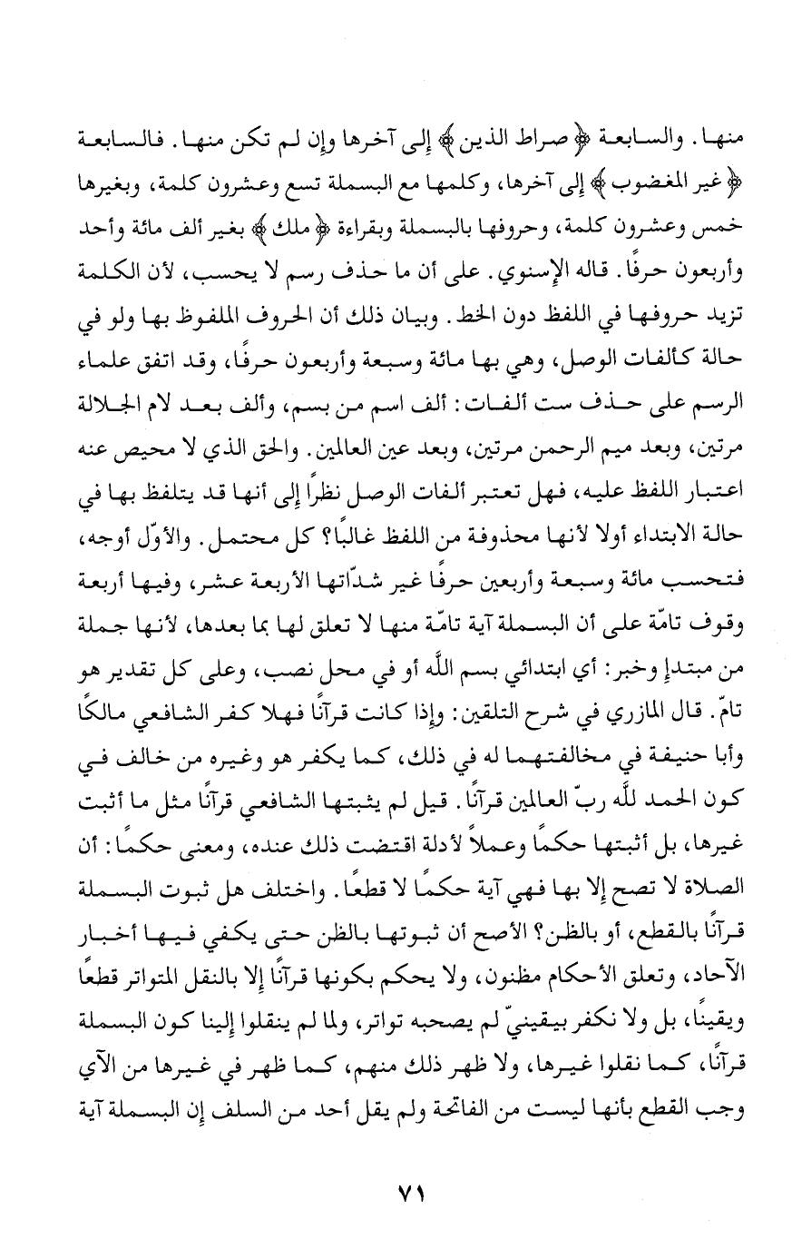 منها. والسابعة صِراطَ الَّذِينَ إلى آخرها وإن لم تكن منها. فالسابعة غَيْرِ الْمَغْضُوبِ إلى آخرها، وكلمها مع البسملة تسع وعشرون كلمة، وبغيرها خمس وعشرون كلمة، وحروفها بالبسملة وبقراءة (ملك) بغير ألف مائة وأحد وأربعون حرفا. قاله الإسنوي. على أن ما حذف رسم لا يحسب، لأن الكلمة تزيد حروفها في اللفظ دون الخط. وبيان ذلك أن الحروف الملفوظ بها ولو في حالة كألفات الوصل، وهي بها مائة وسبعة وأربعون حرفا، وقد اتفق علماء الرسم على حذف ست ألفات: ألف اسم من بسم، وألف بعد لام الجلالة مرتين، وبعد ميم الرحمن مرتين، وبعد عين العالمين. والحق الذي لا محيص عنه اعتبار اللفظ عليه، فهل تعتبر ألفات الوصل نظرا إلى أنها قد يتلفظ بها في حالة الابتداء أولا لأنها محذوفة من اللفظ غالبا؟ كل محتمل. والأوّل أوجه، فتحسب مائة وسبعة وأربعين حرفا غير شدّاتها الأربعة عشر، وفيها أربعة وقوف تامّة على أن البسملة آية تامّة منها لا تعلق لها بما بعدها، لأنها جملة من مبتدإ وخبر: أي ابتدائي بسم الله أو في محل نصب، وعلى كل تقدير هو تامّ. قال المازري في شرح التلقين: وإذا كانت قرآنا فهلا كفر الشافعي مالكا وأبا حنيفة في مخالفتهما له في ذلك، كما يكفر هو وغيره من خالف في كون الحمد لله ربّ العالمين قرآنا. قيل لم يثبتها الشافعي قرآنا مثل ما أثبت غيرها، بل أثبتها حكما وعملا لأدلة اقتضت ذلك عنده، ومعنى حكما: أن الصلاة لا تصح إلا بها فهي آية حكما لا قطعا. واختلف هل ثبوت البسملة قرآنا بالقطع، أو بالظن؟ الأصح أن ثبوتها بالظن حتى يكفي فيها أخبار الآحاد، وتعلق الأحكام مظنون، ولا يحكم بكونها قرآنا إلا بالنقل المتواتر قطعا ويقينا، بل ولا نكفر بيقينيّ لم يصحبه تواتر، ولما لم ينقلوا إلينا كون البسملة قرآنا، كما نقلوا غيرها، ولا ظهر ذلك منهم، كما ظهر في غيرها من الآي وجب القطع بأنها ليست من الفاتحة ولم يقل أحد من السلف إن البسملة آية