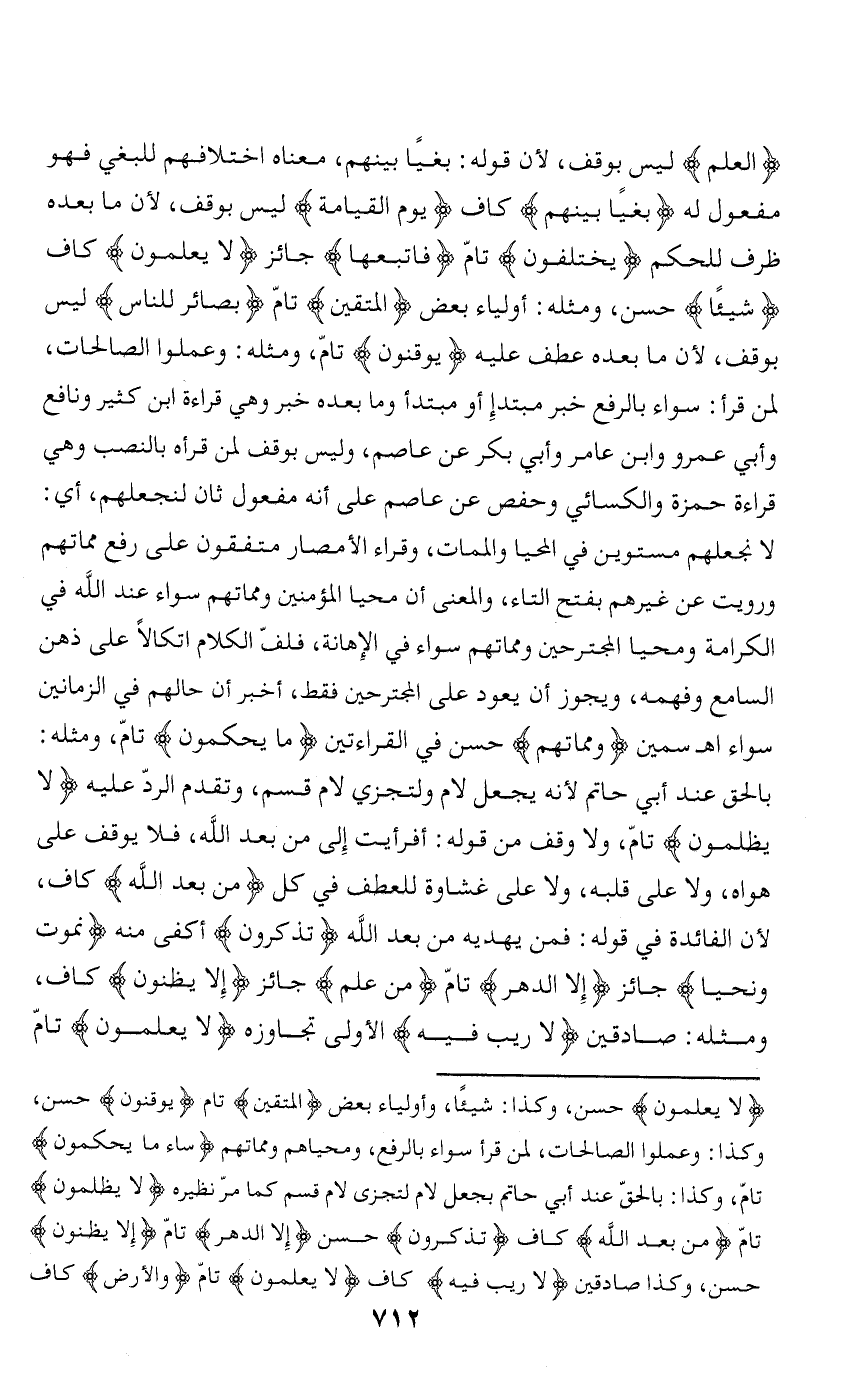 الْعِلْمُ ليس بوقف، لأن قوله: بغيا بينهم، معناه اختلافهم للبغي فهو مفعول له بَغْياً بَيْنَهُمْ كاف يَوْمَ الْقِيامَةِ ليس بوقف، لأن ما بعده ظرف للحكم يَخْتَلِفُونَ تامّ فَاتَّبِعْها جائز لا يَعْلَمُونَ كاف شَيْئاً حسن، ومثله: أولياء بعض الْمُتَّقِينَ تامّ بَصائِرُ لِلنَّاسِ ليس بوقف، لأن ما بعده عطف عليه يُوقِنُونَ تامّ، ومثله: وعملوا الصالحات، لمن قرأ: سواء بالرفع خبر مبتدإ أو مبتدأ وما بعده خبر وهي قراءة ابن كثير ونافع وأبي عمرو وابن عامر وأبي بكر عن عاصم، وليس بوقف لمن قرأه بالنصب وهي قراءة حمزة والكسائي وحفص عن عاصم على أنه مفعول ثان لنجعلهم، أي: