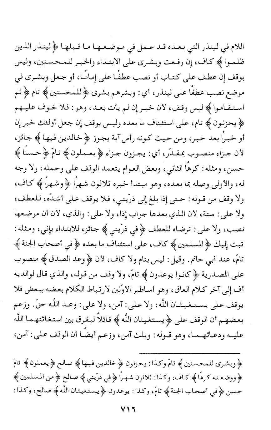 اللام في لينذر التي بعده قد عمل في موضعها ما قبلها لِيُنْذِرَ الَّذِينَ ظَلَمُوا كاف، إن رفعت وبشرى على الابتداء والخبر للمحسنين، وليس بوقف إن عطف على كتاب أو نصب عطفا على إماما، أو جعل وبشرى في موضع نصب عطفا على لينذر، أي: وبشرهم بشرى لِلْمُحْسِنِينَ تام ثُمَّ اسْتَقامُوا ليس وقف، لأن خبر إن لم يأت بعد، وهو: فلا خوف عليهم يَحْزَنُونَ تام، على استئناف ما بعده وليس بوقف إن جعل أولئك خبر إن أو خبرا بعد خبر، ومن حيث كونه رأس آية يجوز خالِدِينَ فِيها جائز، لأن جزاء منصوب بمقدّر، أي: يجزون جزاء يَعْمَلُونَ تامّ حسنا حسن، ومثله: كرها الثاني، وبعض العوام يتعمد الوقف على وحمله، ولا وجه له، والأولى وصله بما بعده، وهو مبتدأ خبره ثلاثون شهرا وشَهْراً كاف، ولا وقف من قوله: حتى إذا بلغ إلى ذرّيتي، فلا يوقف على أشدّه، للعطف، ولا على: ستة، لأن الذي بعدها جواب إذا، ولا على: والذي، لأن أن موضعها نصب، ولا على: ترضاه للعطف فِي ذُرِّيَّتِي جائز، للابتداء بإني، ومثله: