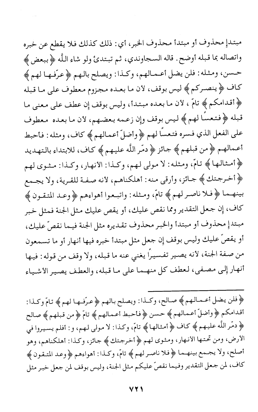 مبتدإ محذوف أو مبتدأ محذوف الخبر، أي: ذلك كذلك فلا يقطع عن خبره واتصاله بما قبله أوضح. قاله السجاوندي، ثم تبتدئ ولو شاء الله بِبَعْضٍ حسن، ومثله: فلن يضل أعمالهم، وكذا: ويصلح بالهم عَرَّفَها لَهُمْ كاف يَنْصُرْكُمْ ليس بوقف، لأن ما بعده مجزوم معطوف على ما قبله أَقْدامَكُمْ تامّ، لأن ما بعده مبتدأ، وليس بوقف إن عطف على معنى ما قبله فَتَعْساً لَهُمْ ليس بوقف وإن زعمه بعضهم، لأن ما بعده معطوف على الفعل الذي فسره فتعسا لهم وَأَضَلَّ أَعْمالَهُمْ كاف، ومثله: فأحبط أعمالهم مِنْ قَبْلِهِمْ جائز دَمَّرَ اللَّهُ عَلَيْهِمْ كاف، للابتداء بالتهديد أَمْثالُها تامّ، ومثله: لا مولى لهم، وكذا: الأنهار، وكذا: مثوى لهم أَخْرَجَتْكَ جائز، وأرقى منه: أهلكناهم، لأنه صفة للقرية، ولا يجمع بينهما فَلا ناصِرَ لَهُمْ تامّ، ومثله: واتبعوا أهواءهم وُعِدَ الْمُتَّقُونَ كاف، إن جعل التقدير ومما نقص عليك، أو يقص عليك مثل الجنة فمثل خبر مبتدإ محذوف أو مبتدأ والخبر محذوف تقديره مثل الجنة فيما نقص عليك، أو يقصّ عليك وليس بوقف إن جعل مثل مبتدأ خبره فيها أنهار أو ما تسمعون من صفة الجنة، لأنه يصير تفسيرا يغني عنه ما قبله، ولا وقف من قوله: فيها أنهار إلى مصفى، لعطف كل منهما على ما قبله، والعطف يصير الأشياء