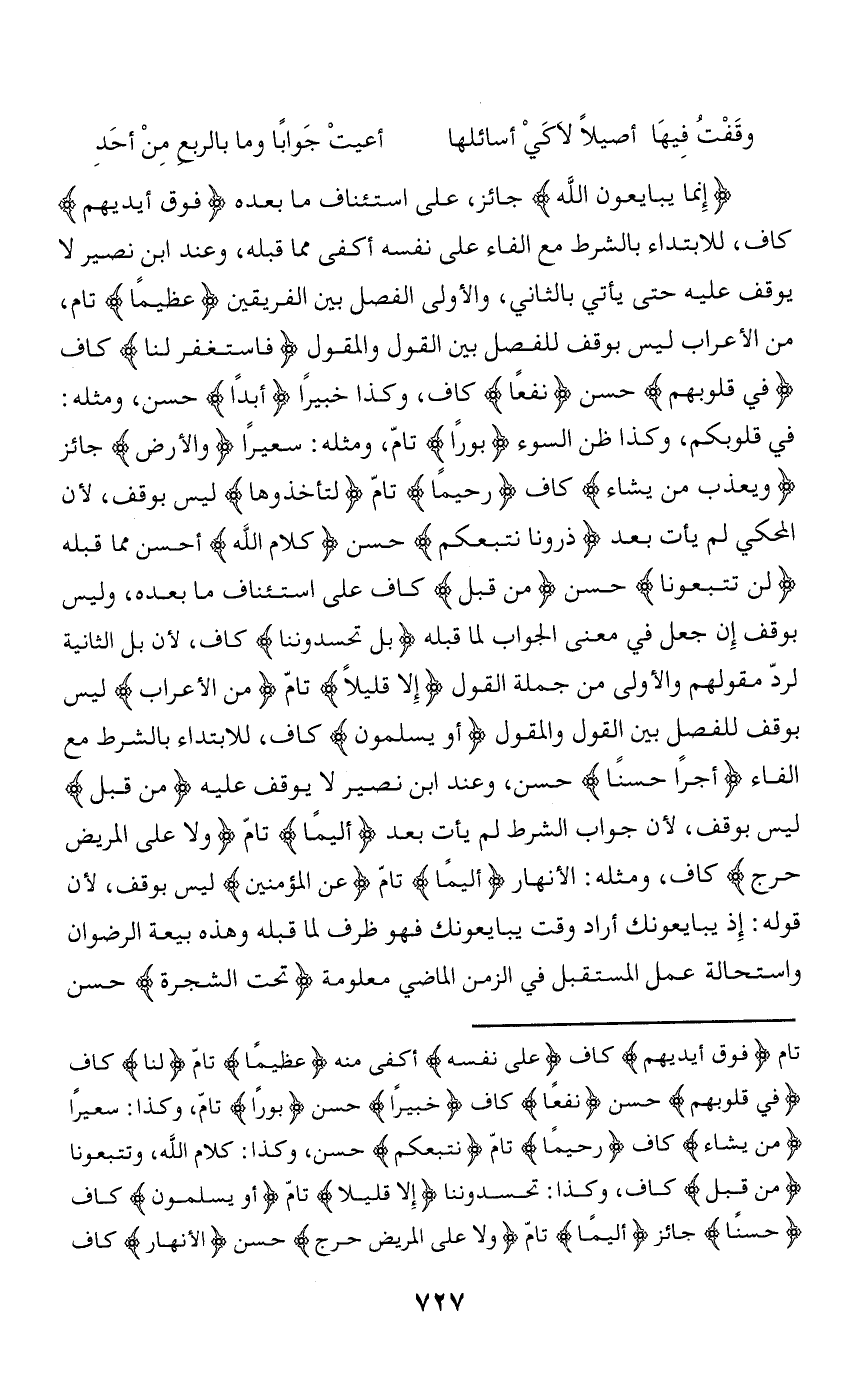 في قلوبكم، وكذا ظن السوء بُوراً تامّ، ومثله: سعيرا وَالْأَرْضِ جائز وَيُعَذِّبُ مَنْ يَشاءُ كاف رَحِيماً تامّ لِتَأْخُذُوها ليس بوقف، لأن المحكي لم يأت بعد ذَرُونا نَتَّبِعْكُمْ حسن كَلامَ اللَّهِ أحسن مما قبله لَنْ تَتَّبِعُونا حسن مِنْ قَبْلُ كاف على استئناف ما بعده، وليس بوقف إن جعل في معنى الجواب لما قبله بَلْ تَحْسُدُونَنا كاف، لأن بل الثانية لردّ مقولهم والأولى من جملة القول إِلَّا قَلِيلًا تامّ مِنَ الْأَعْرابِ ليس بوقف للفصل بين القول والمقول أَوْ يُسْلِمُونَ كاف، للابتداء بالشرط مع الفاء أَجْراً حَسَناً حسن، وعند ابن نصير لا يوقف عليه مِنْ قَبْلُ ليس بوقف، لأن جواب الشرط لم يأت بعد أَلِيماً تامّ وَلا عَلَى الْمَرِيضِ حَرَجٌ كاف، ومثله: الأنهار أَلِيماً تامّ عَنِ الْمُؤْمِنِينَ ليس بوقف، لأن قوله: إذ يبايعونك أراد وقت يبايعونك فهو ظرف لما قبله وهذه بيعة الرضوان واستحالة عمل المستقبل في الزمن الماضي معلومة تَحْتَ الشَّجَرَةِ حسن