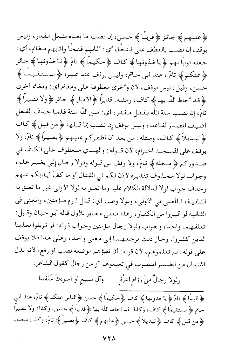 جعله ثوابا لهم يَأْخُذُونَها كاف حَكِيماً تامّ تَأْخُذُونَها جائز عَنْكُمْ تامّ، عند أبي حاتم، وليس بوقف عند غيره مُسْتَقِيماً حسن، وقيل: ليس بوقف، لأن وأخرى معطوفة على ومغانم أي: ومغانم أخرى قَدْ أَحاطَ اللَّهُ بِها كاف، ومثله: قديرا الْأَدْبارَ جائز وَلا نَصِيراً تامّ، إن نصب سنة الله بفعل مقدر، أي: سن الله سنة فلما حذف الفعل أضيف المصدر لفاعله، وليس بوقف إن نصب بما قبلها مِنْ قَبْلُ كاف تَبْدِيلًا كاف، ومثله: من بعد أن أظفركم عليهم بَصِيراً تامّ، ولا يوقف على المسجد الحرام، لأن قوله: والهدي معطوف