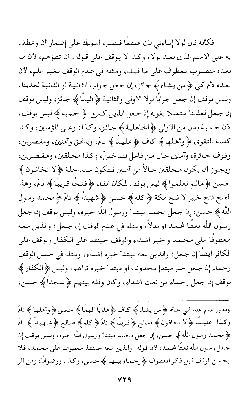 فكأنه قال لولا إساءتي لك علقما فنصب أسوءك على إضمار أن وعطف به على الاسم الذي بعد لولا، وكذا لا يوقف على قوله: أن تطؤهم، لأن ما بعده منصوب معطوف على ما قبله، ومثله في عدم الوقف بغير علم، لأن بعده لام كي مَنْ يَشاءُ جائز، إن جعل جواب الثانية لو الثانية لعذبنا، وليس بوقف إن جعل جوابا لولا الأولى والثانية أَلِيماً جائز، وليس بوقف إن جعل لعذبنا متصلا بقوله إذ جعل الذين كفروا الْحَمِيَّةَ ليس بوقف، لأن حمية بدل من الأولى الْجاهِلِيَّةِ جائز، وكذا: وعلى المؤمنين، وكذا كلمة التقوى وَأَهْلَها كاف عَلِيماً تامّ، وبالحق وآمنين، ومقصرين، وقوف جائزة، وآمنين حال من فاعل لتدخلنّ، وكذا محلقين، ومقصرين، ويجوز أن يكون محلقين حالا من آمنين فتكون متداخلة لا تَخافُونَ حسن ما لَمْ تَعْلَمُوا ليس بوقف لمكان الفاء فَتْحاً قَرِيباً تامّ، وهذا الفتح فتح خيبر لا فتح مكة كُلِّهِ حسن شَهِيداً تامّ مُحَمَّدٌ رَسُولُ اللَّهِ حسن، إن جعل محمد مبتدأ ورسول الله خبره، وليس بوقف إن جعل رسول الله نعتا لمحمد أو بدلا، ومثله في عدم الوقف إن جعل: والذين معه معطوفا على محمد والخبر أشداء والوقف حينئذ على الكفار ويوقف على الكافر أيضا إن جعل: والذين معه مبتدأ خبره أشدّاء، ومثله في حسن الوقف رحماء إن جعل خبر مبتدإ محذوف أو مبتدأ خبره تراهم، وليس الْكُفَّارِ بوقف إن جعل رحماء من نعت أشداء، وكان وقفه بينهم سُجَّداً حسن،