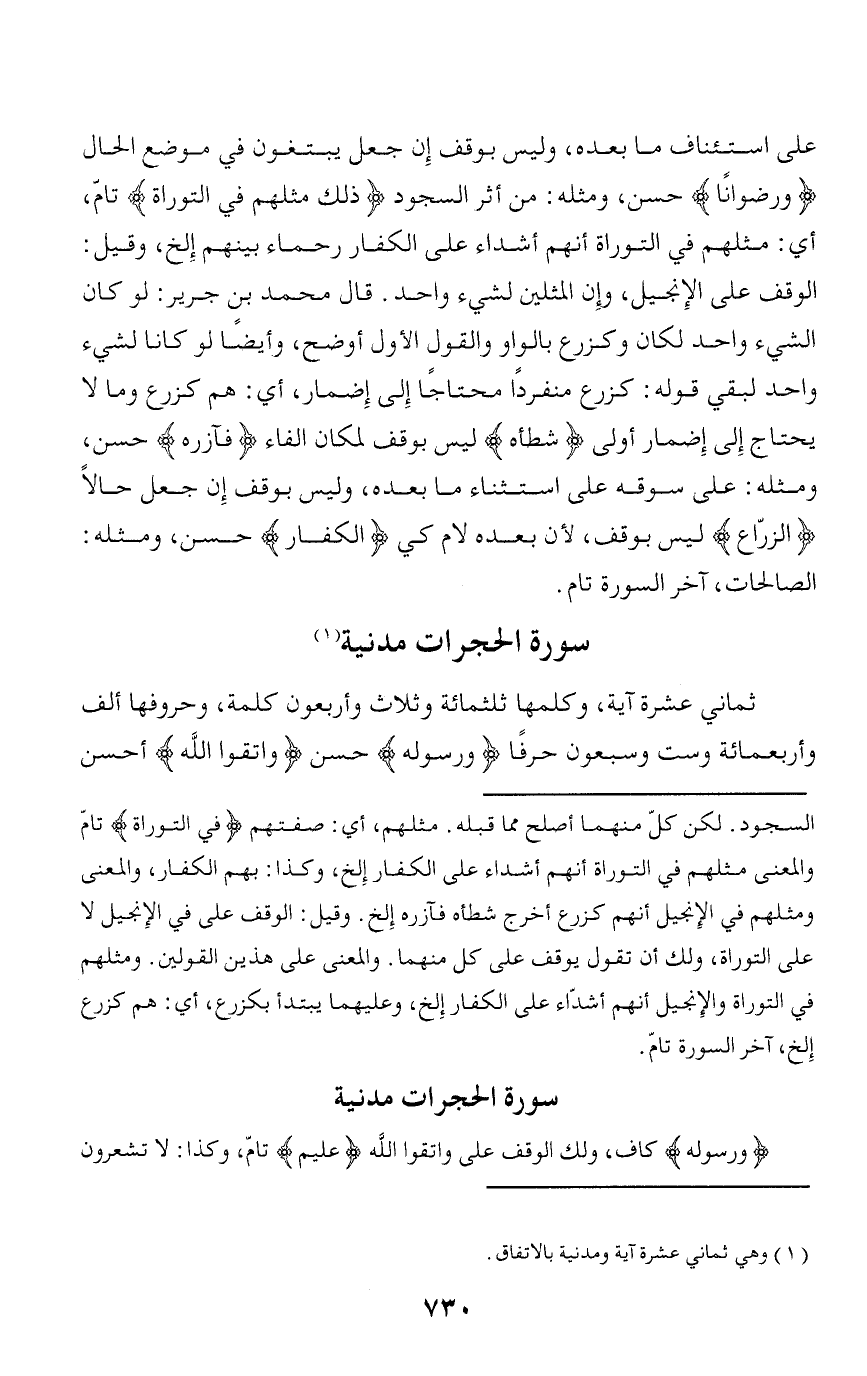 سورة الحجرات مدنية وَرَسُولِهِ كاف، ولك الوقف على واتقوا الله عَلِيمٌ تامّ، وكذا: لا تشعرون