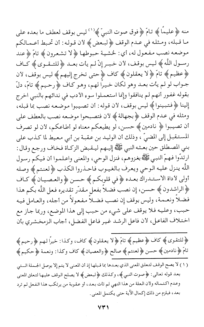 حبوطها لا تَشْعُرُونَ تامّ عِنْدَ رَسُولِ اللَّهِ ليس بوقف، لأن خبر إنّ لم يأت بعد لِلتَّقْوى كاف عَظِيمٌ تامّ لا يَعْقِلُونَ كاف حَتَّى تَخْرُجَ إِلَيْهِمْ ليس بوقف، لأن جواب لو لم يأت بعد وهو لكان خيرا لهم، وهو كاف رَحِيمٌ تامّ، دلّ بقوله غفور أنهم لم ينافقوا وإنما استعملوا سوء الأدب في ندائهم بالنبي أخرج إلينا فَتَبَيَّنُوا ليس بوقف، لأن قوله: أن تصيبوا موضعه نصب بما قبله، ومثله في عدم الوقف بِجَهالَةٍ لأن فتصبحوا موضعه نصب بالعطف على أن تصيبوا نادِمِينَ حسن، لو يطيعكم معناه لو أطاعكم، لأن لو تصرف المستقبل إلى المضيّ، وذلك أن الوليد بن عقبة بن أبي معيط لما كذب على بني المصطلق حين بعثه النبي صلّى الله عليه وسلّم إليهم ليقبض الزكاة فخاف ورجع وقال: