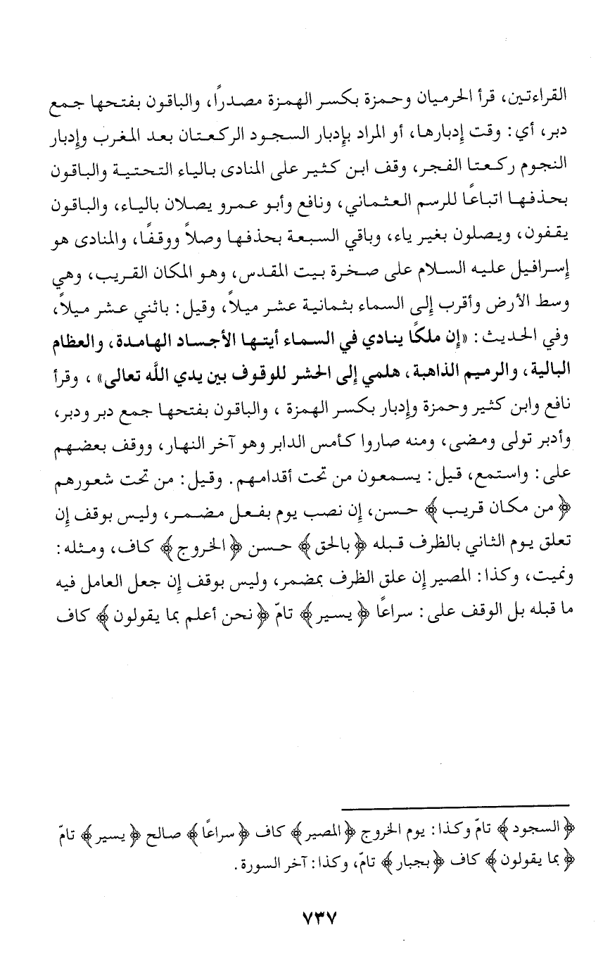 السُّجُودِ تامّ وكذا: يوم الخروج الْمَصِيرُ كاف سِراعاً صالح يَسِيرٌ تامّ بِما يَقُولُونَ كاف بِجَبَّارٍ تامّ، وكذا: آخر السورة.