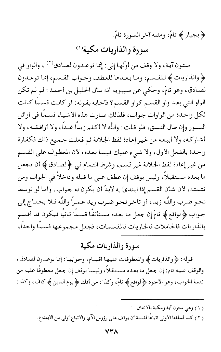 سورة والذاريات مكية قوله: وَالذَّارِياتِ والمعطوفات عليها أقسام، وجوابها: إنما توعدون لصادق، والوقف عليه تام: إن جعل ما بعده مستقلا، وليسا بوقف إن جعل معطوفا عليه من تتمة الجواب، وهو الأجود لَواقِعٌ تامّ، وكذا: من أفك يَوْمُ الدِّينِ كاف، وكذا: