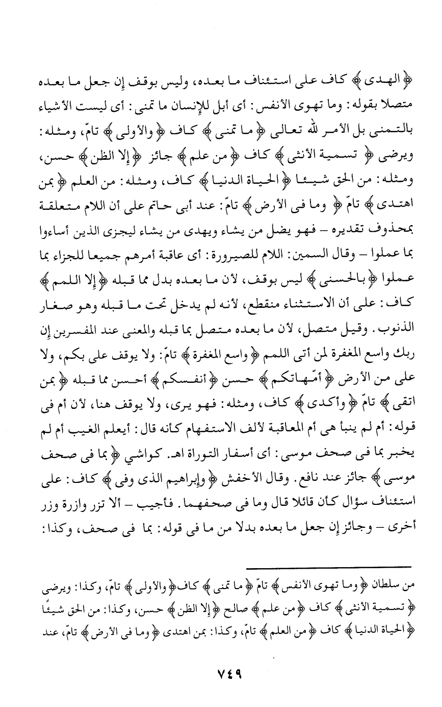 من سلطان وَما تَهْوَى الْأَنْفُسُ تامّ ما تَمَنَّى كاف وَالْأُولى تامّ، وكذا: ويرضى تَسْمِيَةَ الْأُنْثى كاف مِنْ عِلْمٍ صالح إِلَّا الظَّنَّ حسن، وكذا: من الحق شيئا الْحَياةَ الدُّنْيا كاف مِنَ الْعِلْمِ تامّ، وكذا: بمن اهتدى وَما فِي الْأَرْضِ تامّ، عند