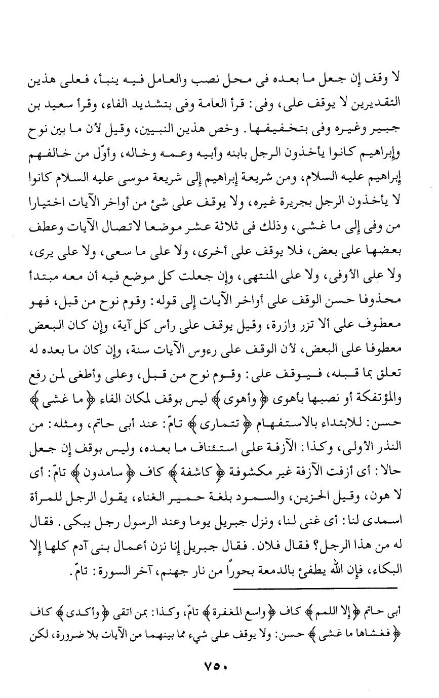 أبى حاتم إِلَّا اللَّمَمَ كاف واسِعُ الْمَغْفِرَةِ تامّ، وكذا: بمن اتقى وَأَكْدى كاف فَغَشَّاها ما غَشَّى حسن: ولا يوقف على شيء مما بينهما من الآيات بلا ضرورة، لكن