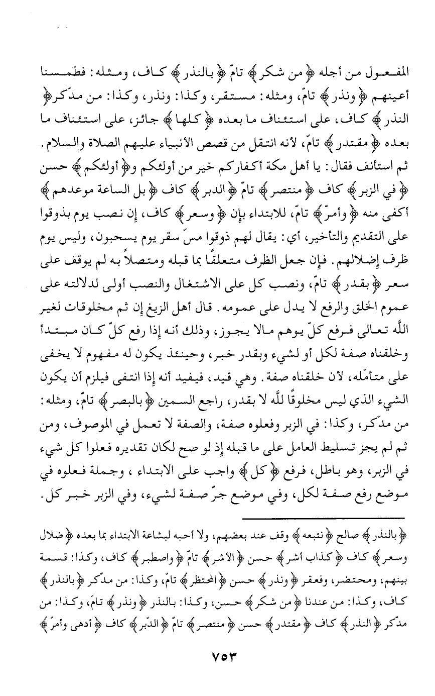 ثم استأنف فقال: يا أهل مكة أكفاركم خير من أولئكم وأُولئِكُمْ حسن فِي الزُّبُرِ كاف مُنْتَصِرٌ تامّ الدُّبُرَ كاف بَلِ السَّاعَةُ مَوْعِدُهُمْ أكفى منه وَأَمَرُّ تامّ، للابتداء بإن وَسُعُرٍ كاف، إن نصب يوم بذوقوا على التقديم والتأخير، أي: يقال لهم ذوقوا مسّ سقر يوم يسحبون، وليس يوم ظرف إضلالهم. فإن جعل الظرف متعلقا بما قبله ومتصلا به لم يوقف على سعر بِقَدَرٍ تامّ، ونصب كل على الاشتغال والنصب أولى لدلالته على عموم الخلق والرفع لا يدل على عمومه. قال أهل الزيغ إن ثم مخلوقات لغير الله تعالى فرفع كلّ يوهم ما لا يجوز، وذلك أنه إذا رفع كلّ كان مبتدأ وخلقناه صفة لكل أو لشيء وبقدر خبر، وحينئذ يكون له مفهوم لا يخفى على متأمّله، لأن خلقناه صفة. وهي قيد، فيفيد أنه إذا انتفى فيلزم أن يكون الشيء الذي ليس مخلوقا لله لا بقدر، راجع السمين بِالْبَصَرِ تامّ، ومثله:
