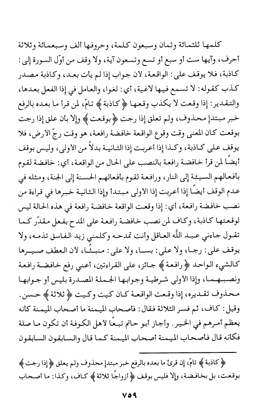 كاذبة، فلا يوقف على: الواقعة، لأن جواب إذا لم يأت بعد، وكاذبة مصدر كذب كقوله: لا تسمع فيها لاغية، أي: لغوا، والعامل في إذا الفعل بعدها، والتقدير: إذا وقعت لا يكذب وقعها كاذِبَةٌ تامّ، لمن قرأ ما بعده بالرفع خبر مبتدإ محذوف، ولم تعلق إذا رجت ب وَقَعَتِ وإلا بأن علق إذا رجت بوقعت كان المعنى وقت وقوع الواقعة خافضة رافعة، هو وقت رجّ الأرض، فلا يوقف على كاذبة، وكذا إذا أعربت إذا الثانية بدلا من الأولى، وليس بوقف أيضا لمن قرأ خافضة رافعة بالنصب على الحال من الواقعة، أي: خافضة لقوم بأفعالهم السيئة إلى النار، ورافعة لقوم بأفعالهم الحسنة إلى الجنة، ومثله في عدم الوقف أيضا إذا أعربت إذا الأولى مبتدأ وإذا الثانية خبرها في قراءة من نصب خافضة رافعة، أي: إذا وقعت الواقعة خافضة رافعة في هذه الحالة ليس لوقعتها كاذبة، وكاف لمن نصب خافضة رافعة على المدح بفعل مقدّر كما تقول جاءني عبد الله العاقل وأنت تمدحه وكلمني زيد الفاسق تذمه، ولا يوقف على: رجا، ولا على: بسا، ولا على: منبثا، لأن العطف صيرها كالشيء الواحد رافِعَةٌ جائز، على القراءتين، أعني رفع خافضة رافعة ونصبهما، وإذا الأولى شرطية وجوابها الجملة المصدرة بليس أو جوابها محذوف تقديره، إذا وقعت الواقعة كان كيت وكيت ثَلاثَةً حسن.