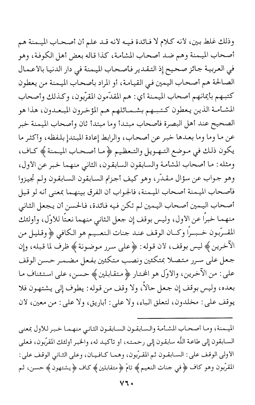 الميمنة، وما أصحاب المشأمة والسابقون الثاني منهما خبر للأول بمعنى السابقون إلى طاعة الله سابقون إلى رحمته، أو تأكيد له، والخبر أولئك المقرّبون، فعلى الأولى الوقف على: السابقون ثم المقرّبون، وهما كافيان، وعلى الثاني الوقف على: