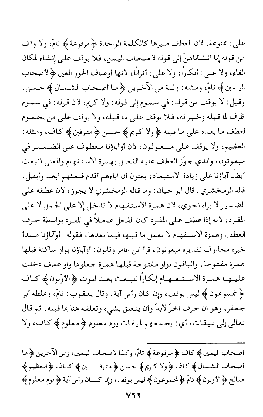 وقيل: لا يوقف من قوله: في سموم إلى قوله: ولا كريم، لأن قوله: في سموم ظرف لما قبله وخبر له، فلا يوقف على ما قبله، ولا يوقف على من يحموم لعطف ما بعده على ما قبله وَلا كَرِيمٍ حسن مُتْرَفِينَ كاف، ومثله:
