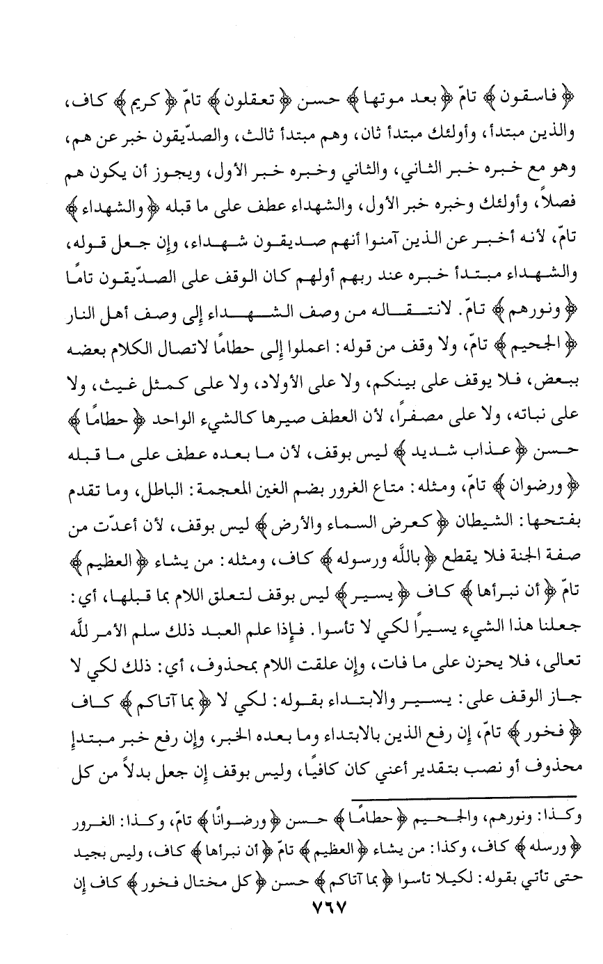 فاسِقُونَ تامّ بَعْدَ مَوْتِها حسن تَعْقِلُونَ تامّ كَرِيمٌ كاف، والذين مبتدأ، وأولئك مبتدأ ثان، وهم مبتدأ ثالث، والصدّيقون خبر عن هم، وهو مع خبره خبر الثاني، والثاني وخبره خبر الأول، ويجوز أن يكون هم فصلا، وأولئك وخبره خبر الأول، والشهداء عطف على ما قبله وَالشُّهَداءُ تامّ، لأنه أخبر عن الذين آمنوا أنهم صديقون شهداء، وإن جعل قوله، والشهداء مبتدأ خبره عند ربهم أولهم كان الوقف على الصدّيقون تاما وَنُورُهُمْ تامّ. لانتقاله من وصف الشهداء إلى وصف أهل النار الْجَحِيمِ تامّ، ولا وقف من قوله: اعلموا إلى حطاما لاتصال الكلام بعضه ببعض، فلا يوقف على بينكم، ولا على الأولاد، ولا على كمثل غيث، ولا على نباته، ولا على مصفرا، لأن العطف صيرها كالشيء الواحد حُطاماً حسن عَذابٌ شَدِيدٌ ليس بوقف، لأن ما بعده عطف على ما قبله وَرِضْوانٌ تامّ، ومثله: متاع الغرور بضم الغين المعجمة: الباطل، وما تقدم بفتحها: