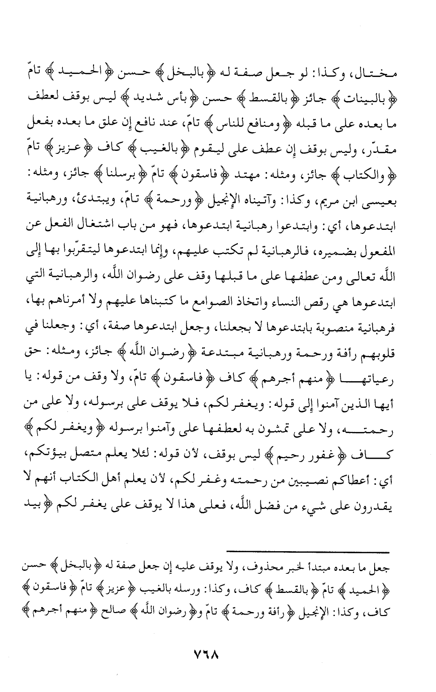 بعيسى ابن مريم، وكذا: وآتيناه الإنجيل وَرَحْمَةً تامّ، ويبتدئ، ورهبانية ابتدعوها، أي: وابتدعوا رهبانية ابتدعوها، فهو من باب اشتغال الفعل عن المفعول بضميره، فالرهبانية لم تكتب عليهم، وإنما ابتدعوها ليتقرّبوا بها إلى الله تعالى ومن عطفها على ما قبلها وقف على رضوان الله، والرهبانية التي ابتدعوها هي رقص النساء واتخاذ الصوامع ما كتبناها عليهم ولا أمرناهم بها، فرهبانية منصوبة بابتدعوها لا بجعلنا، وجعل ابتدعوها صفة، أي: وجعلنا في قلوبهم رأفة ورحمة ورهبانية مبتدعة رِضْوانِ اللَّهِ جائز، ومثله: حق رعياتها مِنْهُمْ أَجْرَهُمْ كاف فاسِقُونَ تامّ، ولا وقف من قوله: يا أيها الذين آمنوا إلى قوله: ويغفر لكم، فلا يوقف على برسوله، ولا على من رحمته، ولا على تمشون به لعطفها على وآمنوا برسوله وَيَغْفِرْ لَكُمْ كاف غَفُورٌ رَحِيمٌ ليس بوقف، لأن قوله: لئلا يعلم متصل بيؤتكم، أي: أعطاكم نصيبين من رحمته وغفر لكم، لأن يعلم أهل الكتاب أنهم لا يقدرون على شيء من فضل الله، فعلى هذا لا يوقف على يغفر لكم بِيَدِ