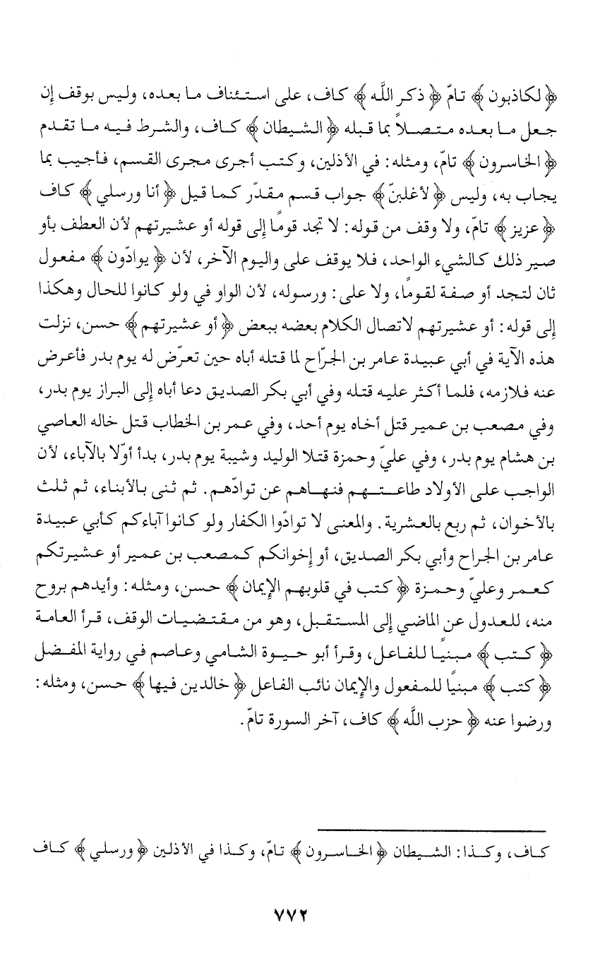 الْكاذِبُونَ تامّ ذِكْرَ اللَّهِ كاف، على استئناف ما بعده، وليس بوقف إن جعل ما بعده متصلا بما قبله الشَّيْطانُ كاف، والشرط فيه ما تقدم الْخاسِرُونَ تامّ، ومثله: في الأذلين، وكتب أجرى مجرى القسم، فأجيب بما يجاب به، وليس لَأَغْلِبَنَّ جواب قسم مقدّر كما قيل أَنَا وَرُسُلِي كاف عَزِيزٌ تامّ، ولا وقف من قوله: لا تجد قوما إلى قوله أو عشيرتهم لأن العطف بأو صير ذلك كالشيء الواحد، فلا يوقف على واليوم الآخر، لأن يُوادُّونَ مفعول ثان لتجد أو صفة لقوما، ولا على: ورسوله، لأن الواو في ولو كانوا للحال وهكذا إلى قوله: أو عشيرتهم لاتصال الكلام بعضه ببعض أَوْ عَشِيرَتَهُمْ حسن، نزلت هذه الآية في أبي عبيدة عامر بن الجرّاح لما قتله أباه حين تعرّض له يوم بدر فأعرض عنه فلازمه، فلما أكثر عليه قتله وفي أبي بكر الصديق دعا أباه إلى البراز يوم بدر، وفي مصعب بن عمير قتل أخاه يوم أحد، وفي عمر بن الخطاب قتل خاله العاصي بن هشام يوم بدر، وفي عليّ وحمزة قتلا الوليد وشيبة يوم بدر، بدأ أوّلا بالآباء، لأن الواجب على الأولاد طاعتهم فنهاهم عن توادّهم. ثم ثنى بالأبناء، ثم ثلث بالأخوان، ثم ربع بالعشرية. والمعنى لا توادّوا الكفار ولو كانوا آباءكم كأبي عبيدة عامر بن الجراح وأبي بكر الصديق، أو إخوانكم كمصعب بن عمير أو عشيرتكم كعمر وعليّ وحمزة كَتَبَ فِي قُلُوبِهِمُ الْإِيمانَ حسن، ومثله: وأيدهم بروح منه، للعدول عن الماضي إلى المستقبل، وهو من مقتضيات الوقف، قرأ العامة كَتَبَ مبنيا للفاعل، وقرأ أبو حيوة الشامي وعاصم في رواية المفضل كَتَبَ مبنيا للمفعول والإيمان نائب الفاعل خالِدِينَ فِيها حسن، ومثله: