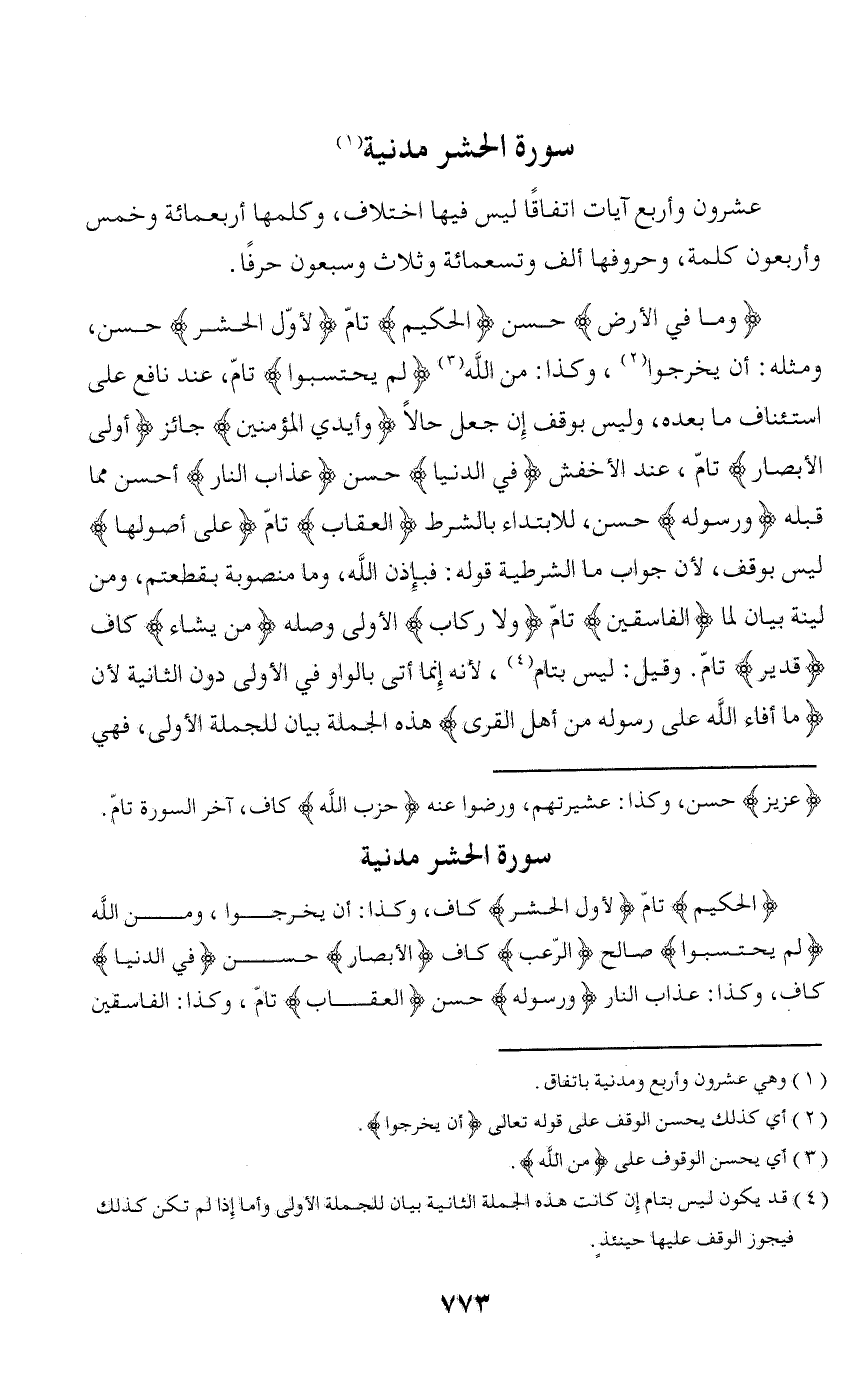 سورة الحشر مدنية الْحَكِيمُ تامّ لِأَوَّلِ الْحَشْرِ كاف، وكذا: أن يخرجوا، ومن الله لَمْ يَحْتَسِبُوا صالح الرُّعْبَ كاف الْأَبْصارِ حسن فِي الدُّنْيا كاف، وكذا: عذاب النار وَرَسُولَهُ حسن الْعِقابِ تامّ، وكذا: الفاسقين
