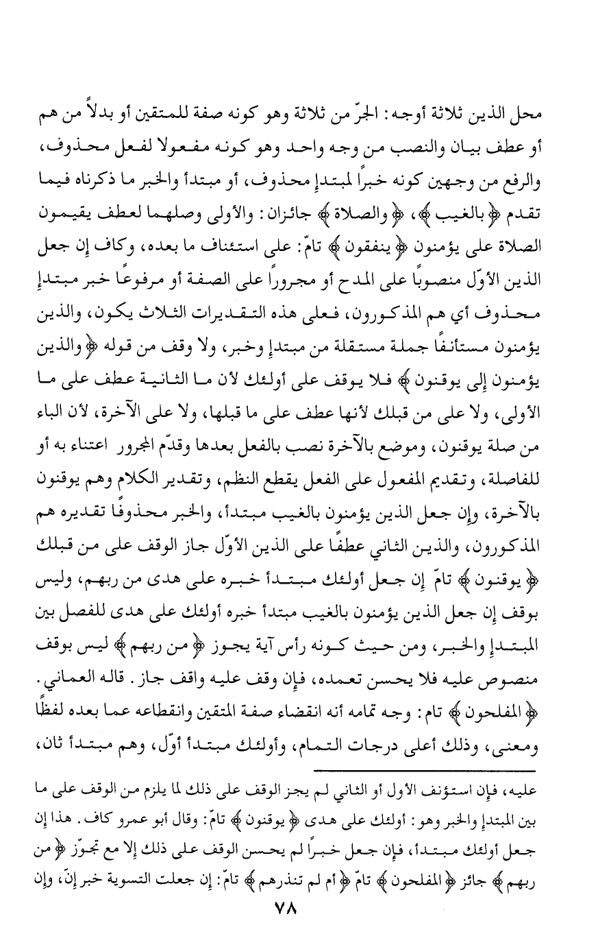 الْمُفْلِحُونَ تام: وجه تمامه أنه انقضاء صفة المتقين وانقطاعه عما بعده لفظا ومعنى، وذلك أعلى درجات التمام، وأولئك مبتدأ أوّل، وهم مبتدأ ثان،