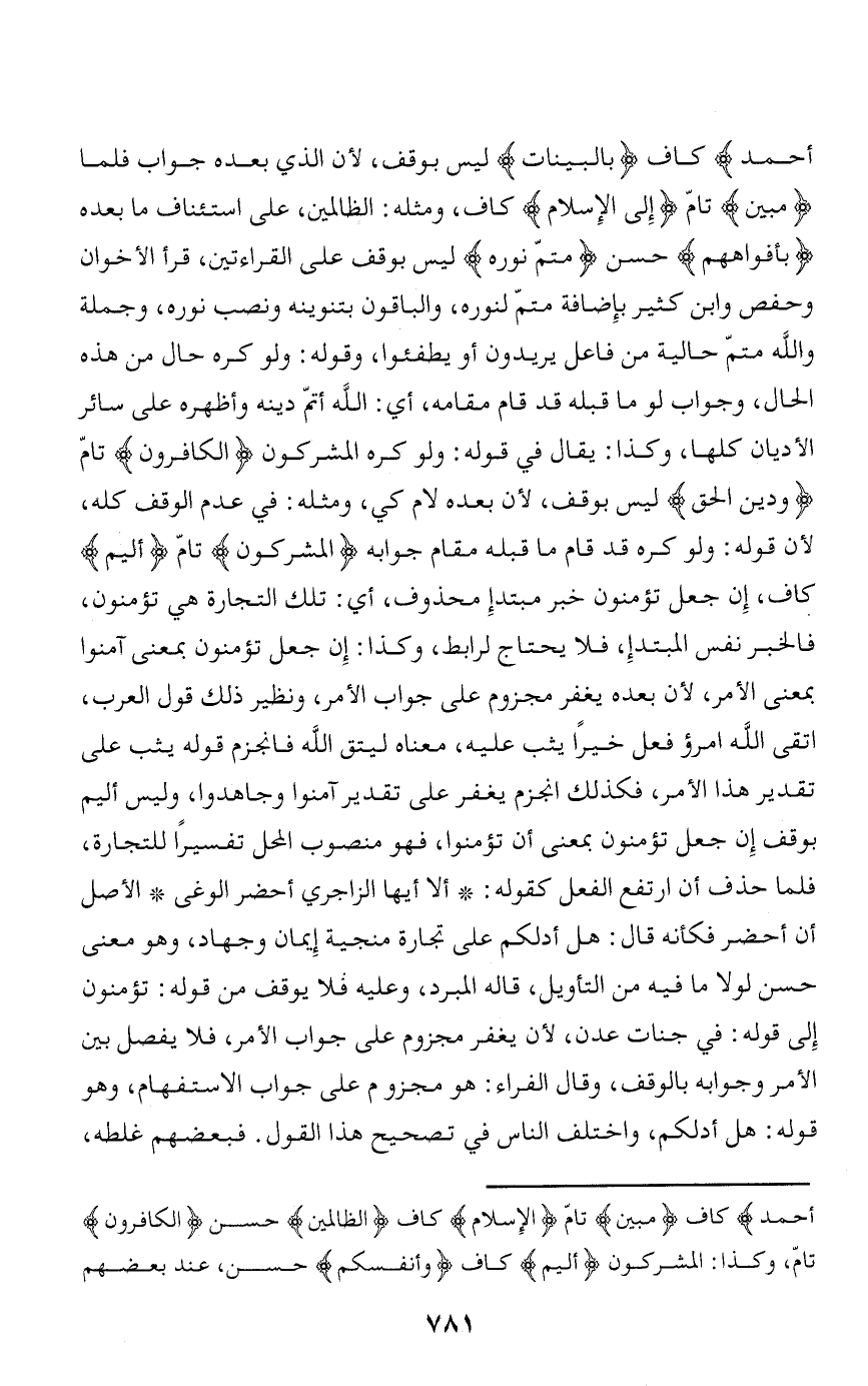أَحْمَدُ كاف بِالْبَيِّناتِ ليس بوقف، لأن الذي بعده جواب فلما مُبِينٌ تامّ إِلَى الْإِسْلامِ كاف، ومثله: الظالمين، على استئناف ما بعده بِأَفْواهِهِمْ حسن مُتِمُّ نُورِهِ ليس بوقف على القراءتين، قرأ الأخوان وحفص وابن كثير بإضافة متمّ لنوره، والباقون بتنوينه ونصب نوره، وجملة والله متمّ حالية من فاعل يريدون أو يطفئوا، وقوله: ولو كره حال من هذه الحال، وجواب لو ما قبله قد قام مقامه، أي: الله أتمّ دينه وأظهره على سائر الأديان كلها، وكذا: يقال في قوله: ولو كره المشركون الْكافِرُونَ تامّ وَدِينِ الْحَقِّ ليس بوقف، لأن بعده لام كي، ومثله: في عدم الوقف كله، لأن قوله: ولو كره قد قام ما قبله مقام جوابه الْمُشْرِكُونَ تامّ أَلِيمٍ كاف، إن جعل تؤمنون خبر مبتدإ محذوف، أي: تلك التجارة هي تؤمنون، فالخبر نفس المبتدإ، فلا يحتاج لرابط، وكذا: إن جعل تؤمنون بمعنى آمنوا بمعنى الأمر، لأن بعده يغفر مجزوم على جواب الأمر، ونظير ذلك قول
