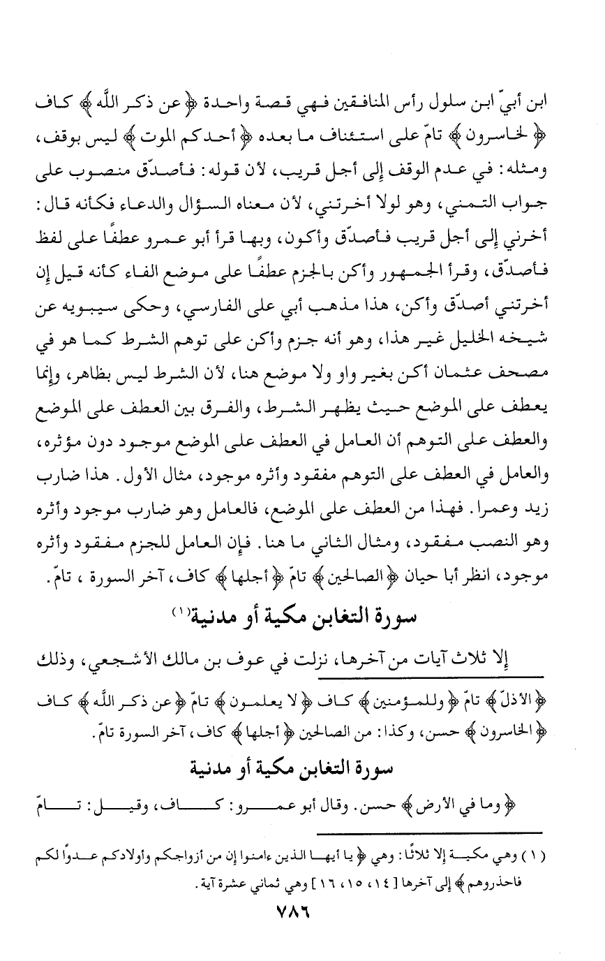 ابن أبيّ ابن سلول رأس المنافقين فهي قصة واحدة عَنْ ذِكْرِ اللَّهِ كاف الْخاسِرُونَ تامّ على استئناف ما بعده أَحَدَكُمُ الْمَوْتُ ليس بوقف، ومثله: في عدم الوقف إلى أجل قريب، لأن قوله: فأصدّق منصوب على جواب التمني، وهو لولا أخرتني، لأن معناه السؤال والدعاء فكأنه قال: