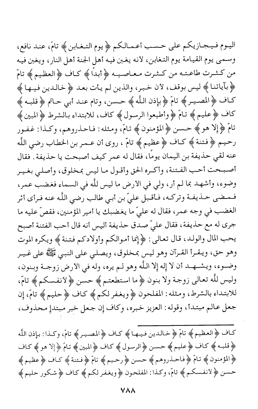 اليوم فيجازيكم على حسب أعمالكم يَوْمُ التَّغابُنِ تامّ، عند نافع، وسمى يوم القيامة يوم التغابن، لأنه يغبن فيه أهل الجنة أهل النار، ويغبن فيه من كثرت طاعته من كثرت معاصيه أَبَداً كاف الْعَظِيمُ تامّ بِآياتِنا ليس بوقف، لأن خبر، والذين لم يأت بعد خالِدِينَ فِيها كاف الْمَصِيرُ تامّ بِإِذْنِ اللَّهِ حسن، وتام عند أبي حاتم قَلْبَهُ كاف عَلِيمٌ تامّ وَأَطِيعُوا الرَّسُولَ كاف، للابتداء بالشرط الْمُبِينُ تامّ إِلَّا هُوَ حسن الْمُؤْمِنُونَ تامّ، ومثله: فاحذروهم، وكذا: غفور رحيم فِتْنَةٌ كاف عَظِيمٌ تامّ، روى أن عمر بن الخطاب رضي الله عنه لقي حذيفة بن اليمان يوما، فقال له عمر كيف أصبحت يا حذيفة. فقال أصبحت أحب الفتنة، وأكره الحق وأقول ما ليس بمخلوق، وأصلي بغير وضوء، وأشهد بما لم أر، ولي في الأرض ما ليس لله في السماء فغضب عمر، فمضى حذيفة وتركه، فأقبل عليّ بن أبي طالب رضي الله عنه فرأى أثر الغضب في وجه عمر، فقال له عليّ ما يغضبك يا أمير المؤمنين، فقصّ عليه ما جرى له مع حذيفة، فقال عليّ صدق حذيفة أليس أنه قال أحب الفتنة أصبح يحب المال والولد، قال تعالى: إِنَّما أَمْوالُكُمْ وَأَوْلادُكُمْ فِتْنَةٌ ويكره الموت وهو حق، ويقرأ القرآن وهو ليس بمخلوق، ويصلي على النبي صلّى الله عليه وسلّم على غير وضوء، ويشهد أن لا إله إلا الله وهو لم يره، وله في الأرض زوجة وبنون، وليس لله تعالى زوجة ولا بنون مَا اسْتَطَعْتُمْ حسن لِأَنْفُسِكُمْ تامّ، للابتداء بالشرط، ومثله: المفلحون وَيَغْفِرْ لَكُمْ كاف حَلِيمٌ تامّ، إن جعل عالم مبتدأ، وقوله: العزيز خبره، وكاف إن جعل خبر مبتدإ محذوف،